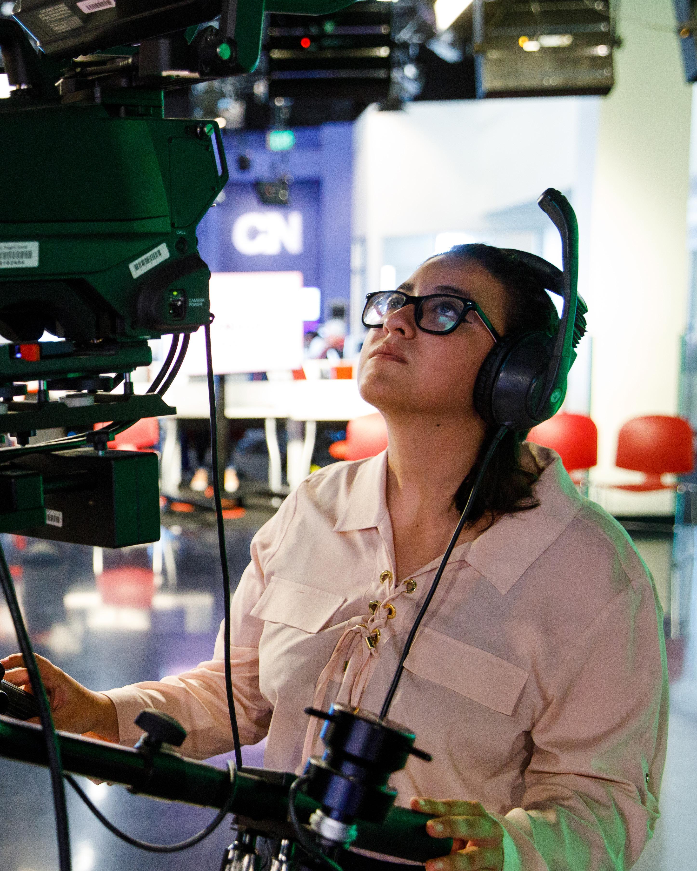 Lurissa Carbajal, a student at the Walter Cronkite School of Journalism and Mass Communication, operates a camera in ASU’s Cronkite News Phoenix studio, where students hone their skills through hands-on experiences.