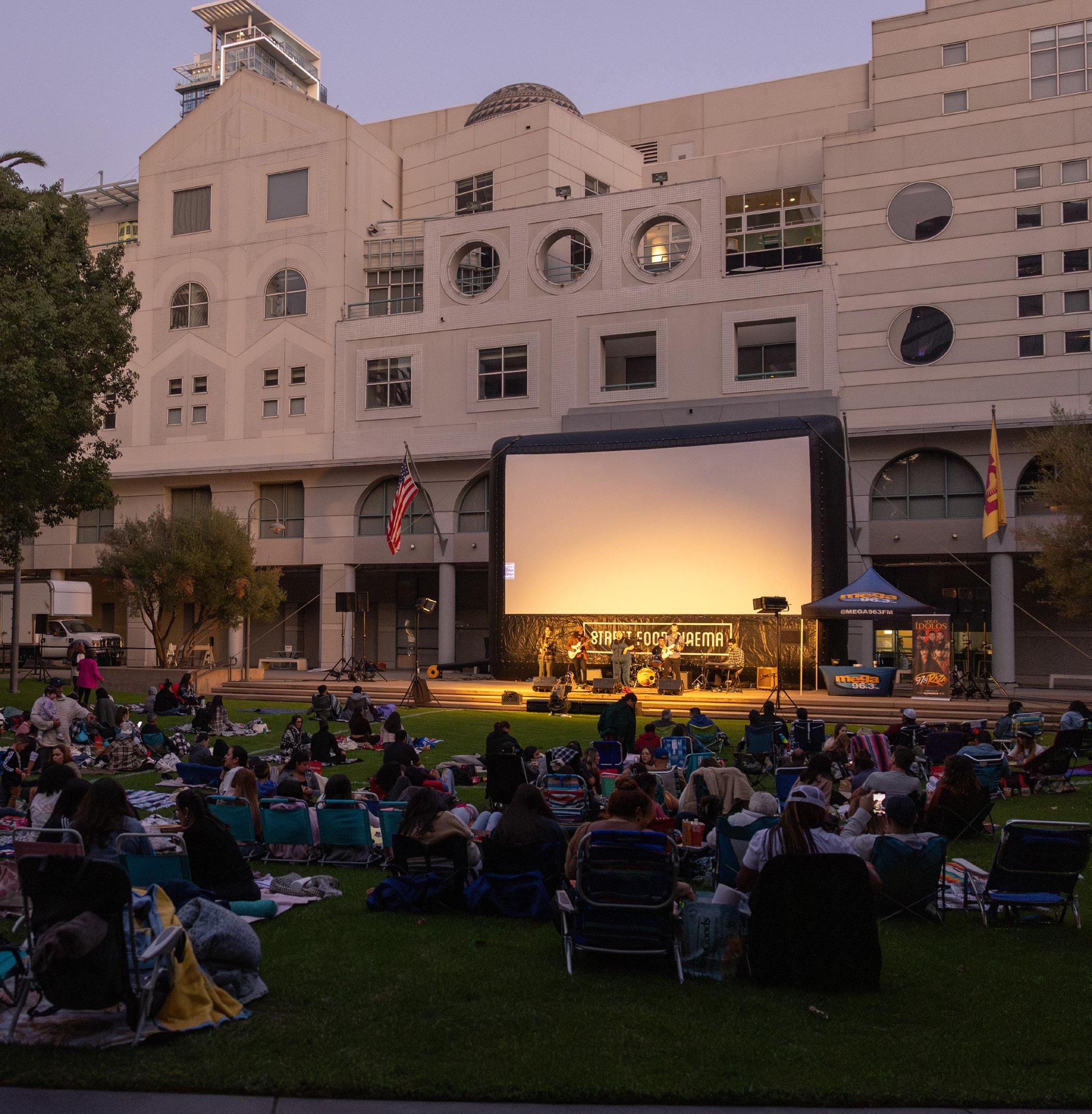 Community members gather for an outdoor concert and movie screening on the lawn at Grand Hope Park, outside of the ASU California Grand Center in Los Angeles.
