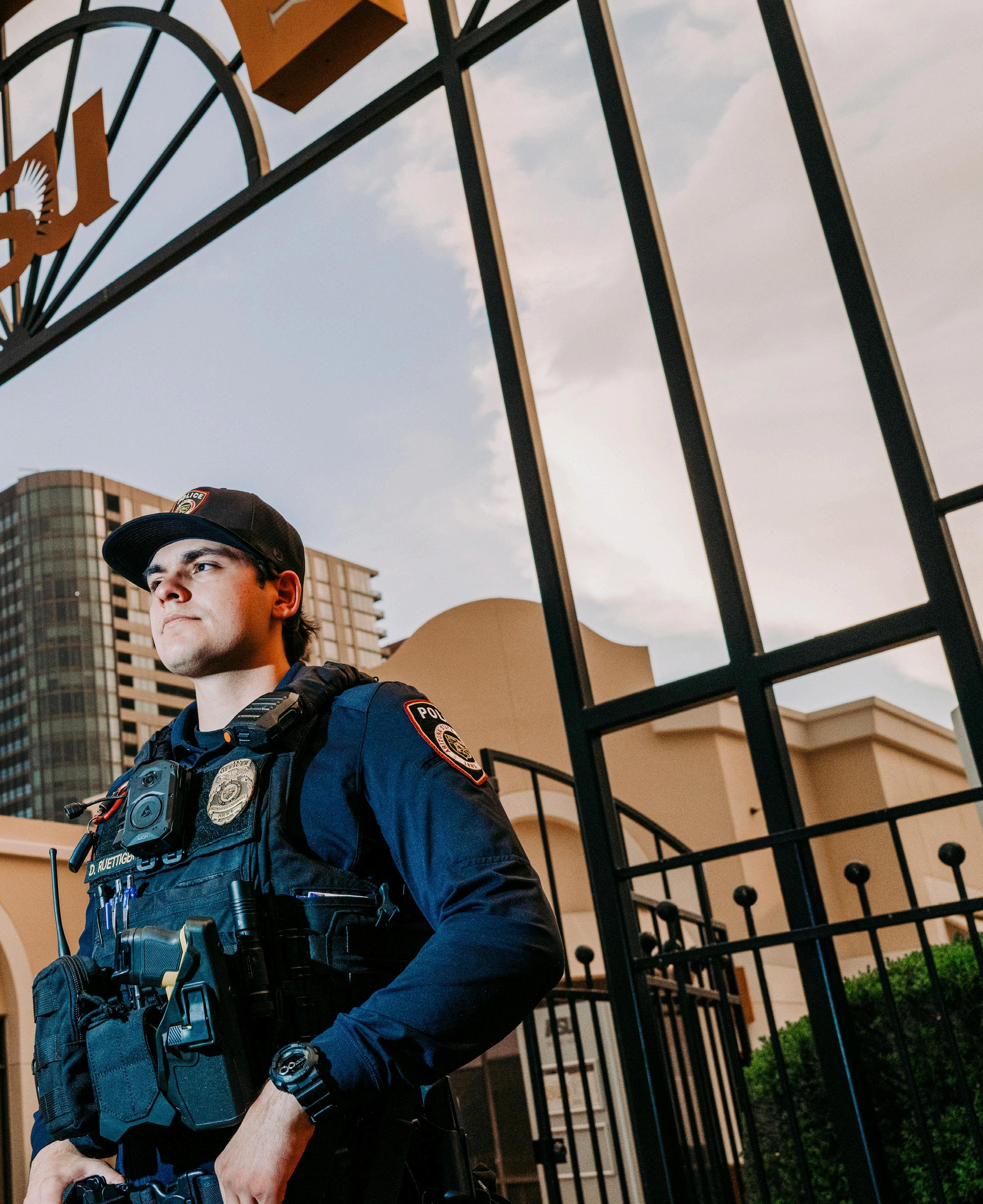 Danny Ruettiger, ’25 BS in criminology and criminal justice, patrols ASU’s downtown campus as an officer in the ASU Police Department.