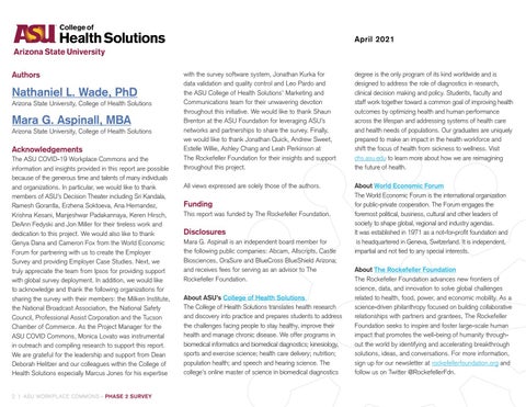 with the survey software system, Jonathan Kurka for data validation and quality control and Leo Pardo and the ASU College of Health Solutionsâ Marketing and Communications team for their unwavering devotion throughout this initiative. We would like to thank Shaun Brenton at the ASU Foundation for leveraging ASUâs networks and partnerships to share the survey. Finally, we would like to thank Jonathan Quick, Andrew Sweet, Estelle Willie, Ashley Chang and Leah Perkinson at The Rockefeller Foundation for their insights and support throughout this project.