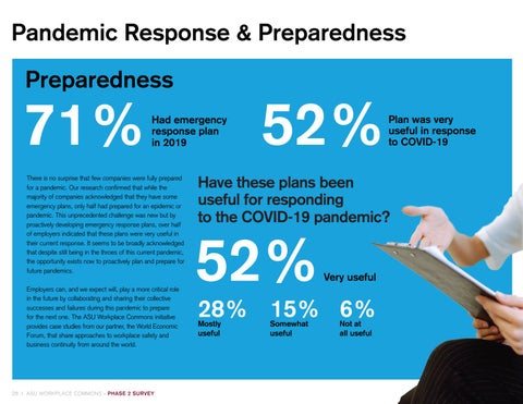 Had emergency response plan in 2019 There is no surprise that few companies were fully prepared for a pandemic. Our research confirmed that while the majority of companies acknowledged that they have some emergency plans, only half had prepared for an epidemic or pandemic. This unprecedented challenge was new but by proactively developing emergency response plans, over half of employers indicated that these plans were very useful in their current response. It seems to be broadly acknowledged that despite still being in the throes of this current pandemic, the opportunity exists now to proactively plan and prepare for future pandemics. Employers can, and we expect will, play a more critical role in the future by collaborating and sharing their collective successes and failures during this pandemic to prepare for the next one. The ASU Workplace Commons initiative provides case studies from our partner, the World Economic Forum, that share approaches to workplace safety and business continuity from around the world.