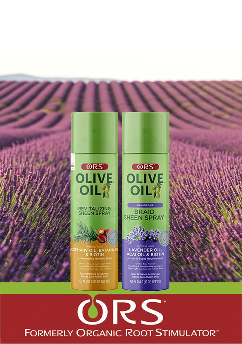 ORS Olive Oil Braidzone Braid Sheen Spray (Lavender Oil) is a lightweight nishing spray made for protective styles—braids, twists, and locs. It’s infused with lavender oil, açaí oil, and biotin to add soft shine, help soothe the scalp, and keep styles looking fresh without a heavy, greasy feel. ORS positions it within the Braidzone line speci cally for braid maintenance, and listings note an alcohol-free formula suitable for daily use.