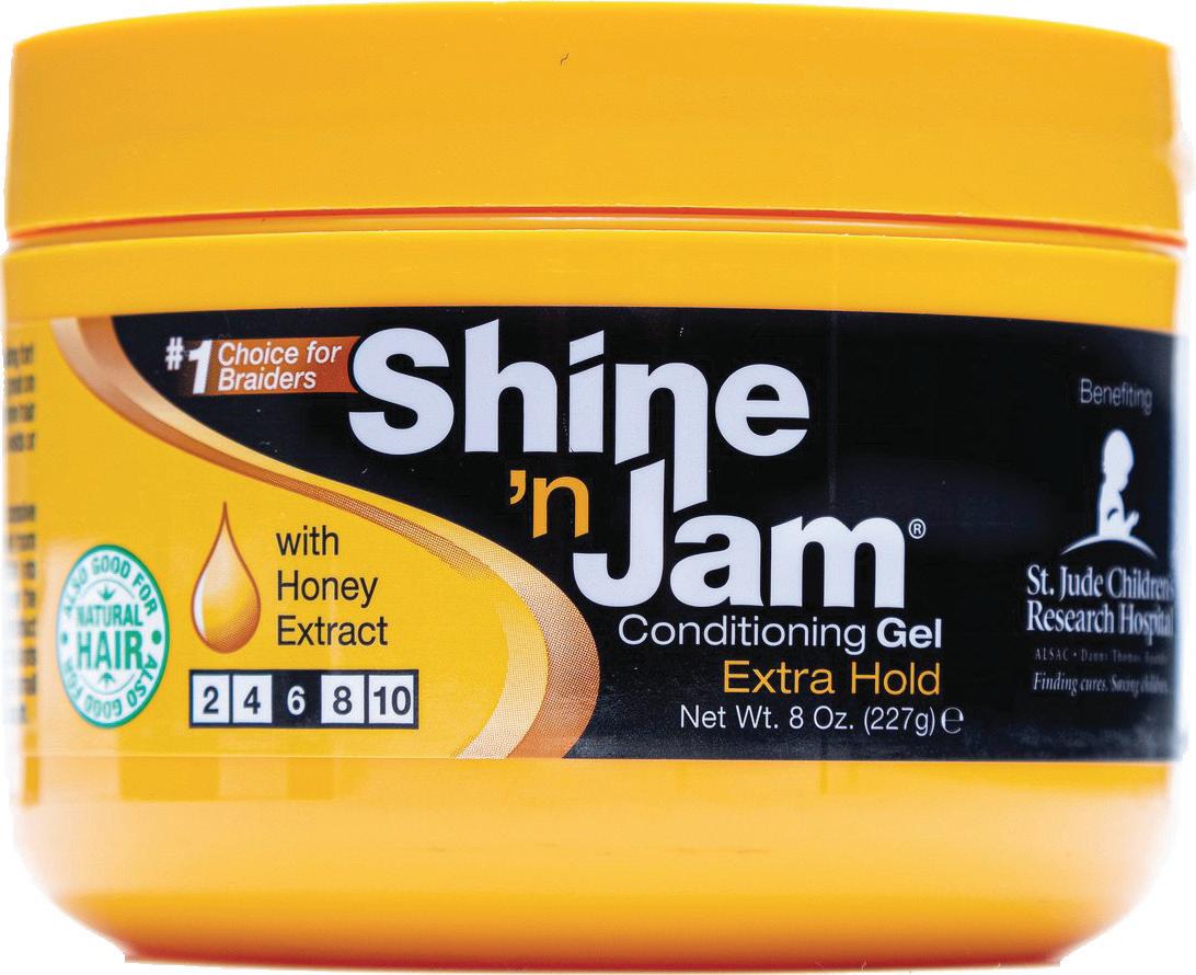 Shine ’n Jam® Extra Hold Conditioning Gel is a strong-hold, non-flaking styling gel designed for braids, twists, edges, and textured hair. It offers an extra firm hold while maintaining a non-greasy shine, and is enhanced with honey extract to help strengthen hair. The formula is free of alcohol, parabens, wax, petrolatum, and silicones, aiming to condition as it styles. Users report that it resists flaking and maintains control throughout the day.