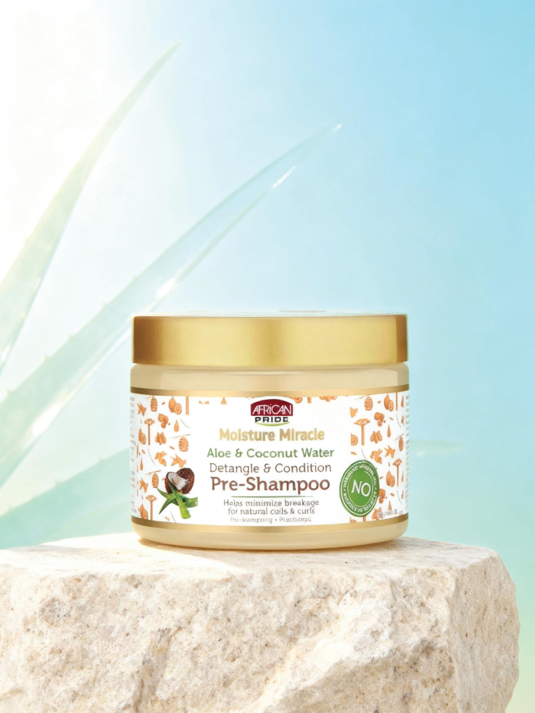 African Pride Moisture Miracle Aloe & Coconut Water Pre-Shampoo is a detangling and conditioning pre-wash treatment crafted especially for coily and curly hair textures. Infused with aloe vera and coconut water, it delivers deep hydration and remarkable slip to glide through coils, minimizing breakage and easing the wash day process. Free from parabens, sulfates, mineral oil, and petrolatum, it o ers a clean, gentle formula that softens hair, protects strands during cleansing, and leaves curls easier to manage. This pre-shampoo softens knots, smooths strands, and provides the slip you need before cleansing. Enriched with aloe vera and coconut water, it helps lock in moisture, reduce breakage, and protect hair during wash day, leaving it more manageable and ready for styling.