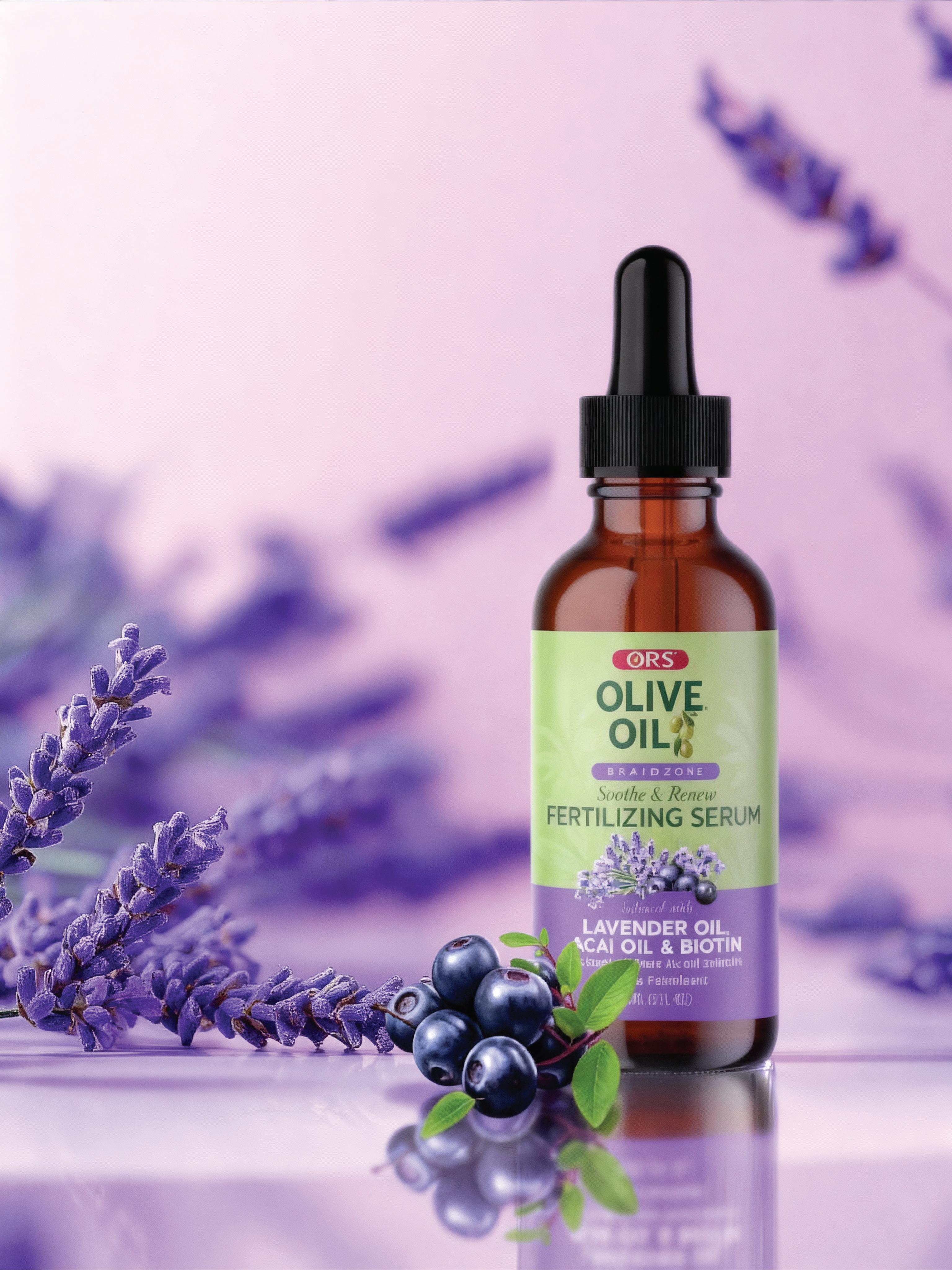 The ORS Olive Oil Braidzone Fertilizing Serum (2 oz) is a nutrient-infused scalp treatment specially formulated for protective styles like braids, locs, twists, wigs, and weaves. Blended with a triple oil complex of olive, lavender, and acai oils, along with biotin and herbal extracts, it soothes dry or aky scalps, supports moisture retention, and helps sustain a healthy scalp environment while hair remains in style. The lightweight formula glides easily without leaving heavy residue and can be used daily to nourish roots and maintain scalp comfort in between wash days.
