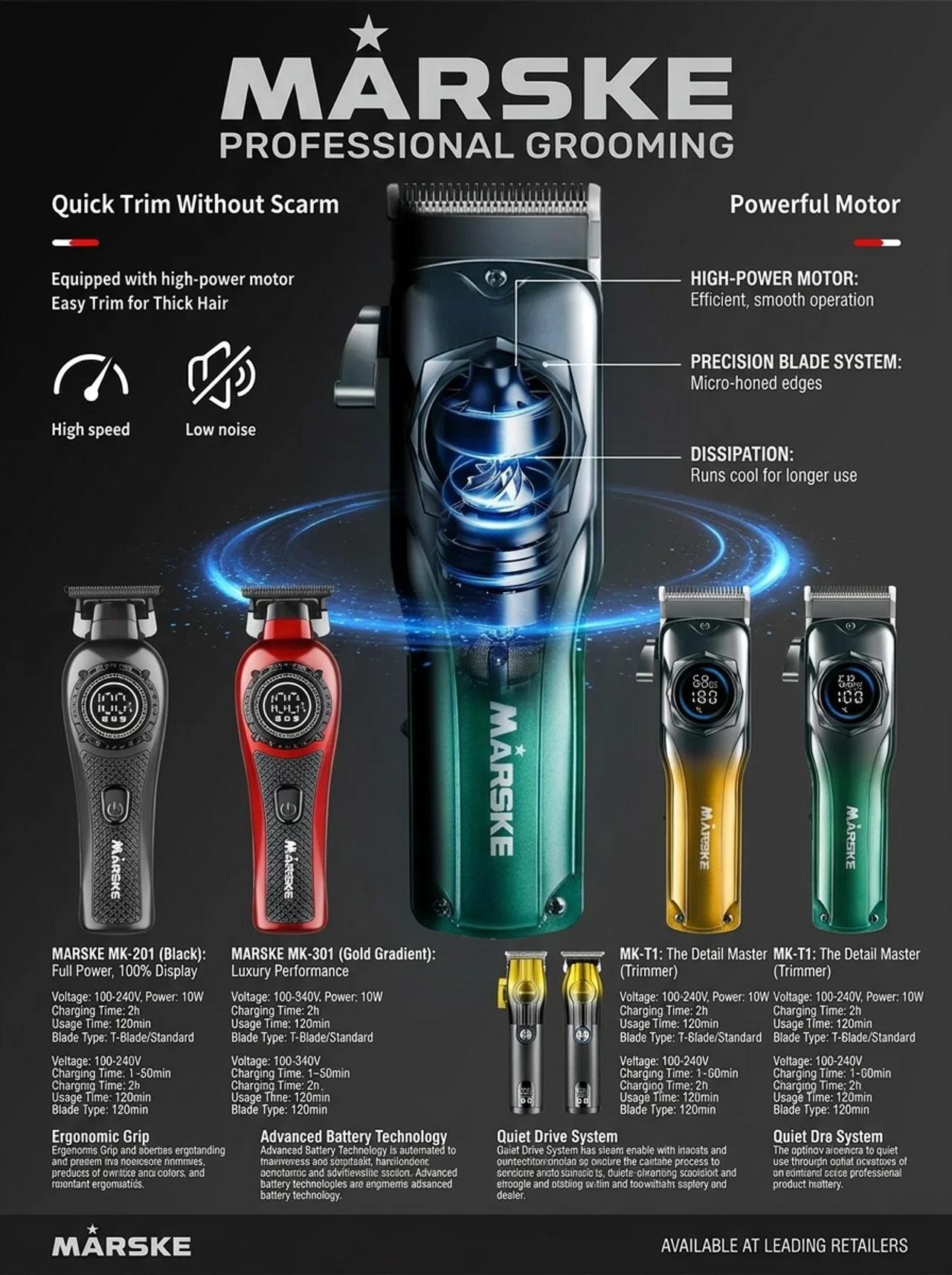 The MARSKE Professional Wireless Precision Trimmer is the ultimate tool for achieving sharp lines, crisp edges, and intricate detail work. Designed as the perfect companion to the bulk-cutting clipper, this lightweight trimmer features a high-performance T-blade that allows for "zero-gap" results on necklines, sideburns, and beards. With its ergonomic design and powerful motor, it provides the control and visibility needed for artistic hair designs and professional grooming at home.