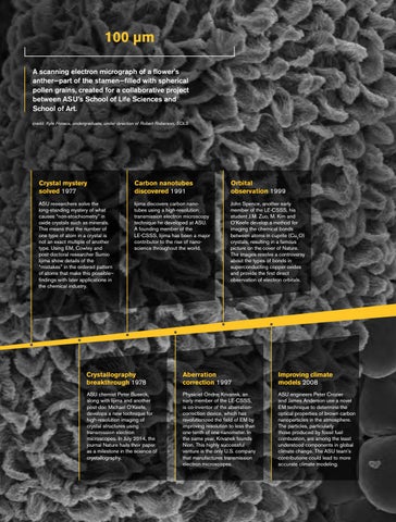 100 µm A scanning electron micrograph of a flower’s anther—part of the stamen—filled with spherical pollen grains, created for a collaborative project between ASU’s School of Life Sciences and School of Art. credit: Kyle Horace, undergraduate, under direction of Robert Roberson, SOLS