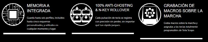 Macros, administración y memoria integrada: Mapea comandos de varias teclas, ajusta la configuración mediante Armory Crate y almacena hasta cinco perfiles en la memoria integrada.