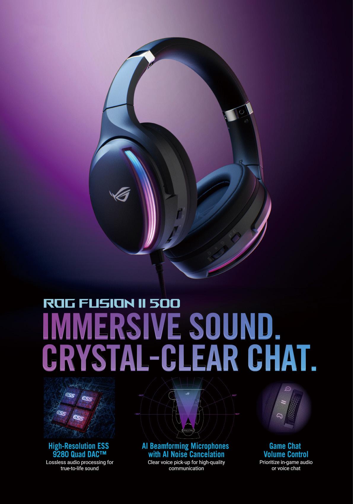 Quick start guide • 7.1 surround sound with eight ASUS Essence drivers and virtual subwoofers for incredibly immersive gaming audio and powerful bass • ASUS AI Noise-Canceling Microphone offers crystal-clear in-game voice communication • Four ESS 9601 headphone drivers and exclusively customized ROG home-theater-grade 7.1 DAC provide exceptional