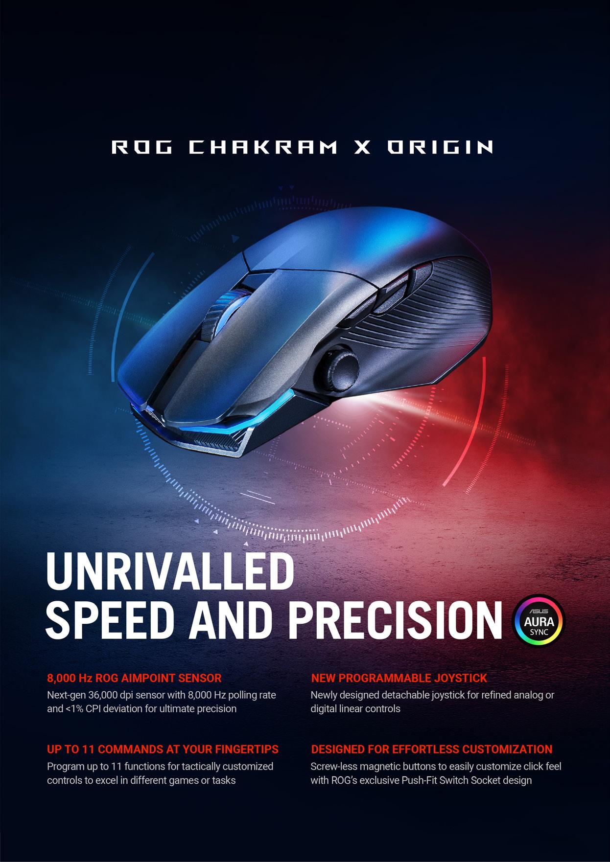 Built to rule the battlefield, ROG Chakram X Origin is a 36,000-dpi optical gaming mouse with an 8000 Hz polling rate for unmatched precision, plus seven buttons and a four-directional joystick. Featuring sensitivity levels ranging from 100 to 36,000 dpi, the ROG AimPoint optical sensor tracks every movement with unrivalled precision with industry-leading <1% CPI deviation. The sensor registers movement at speeds of up to 650 inches per second (ips) at up to 50 g acceleration, for swift, effective strikes. With 11 separate input functions, including the programmable joystick, Chakram X Origin can be tactically customized for different games or tasks. The mouse also stores up to five profiles in its onboard memory for personalized settings anywhere.