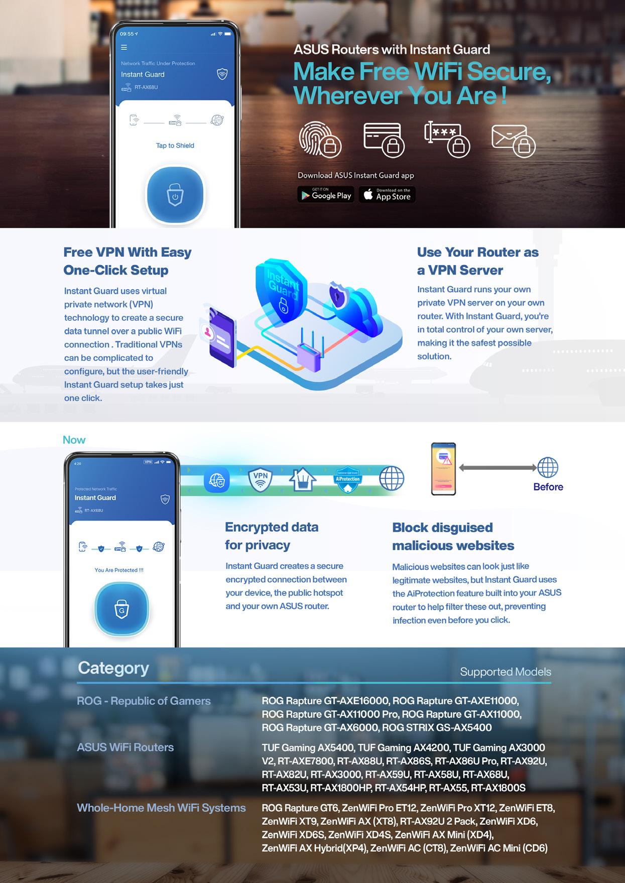 An upgrade of the award-winning ASUS ZenWiFi XT8, this tri-band WiFi 6 mesh system is designed to easily set up a reliable, secure and whole-home smart network that can cover up to 5,700 square feet — and with 160 MHz channels delivering speeds of up to 7800 Mbps. A dedicated WiFi backhaul channel on the second 5 GHz band is used for mesh-traffic communication, leaving the other bands open to maximize and stabilize WiFi speeds. It also features a 2.5 Gbps WAN port for seamless compatibility with the ultrafast connections offered by an increasing number of internet service providers. The combination of a flagship Broadcom WiFi 6 chipset, a 1.7 GHz quad-core CPU and ASUS RangeBoost Plus RF technology, means ZenWiFi XT9 provides users with a seamless WiFi experiences when moving around the home. Support for ASUS AiMesh technology makes it easy to expand the mesh network. ZenWiFi XT9 also features multiple layers of free network protection, including ASUS AiProtection Pro powered by Trend Micro™, advanced parental controls and the free ASUS Instant Guard mobile app to route internet connections through the home network via an encrypted VPN tunnel.