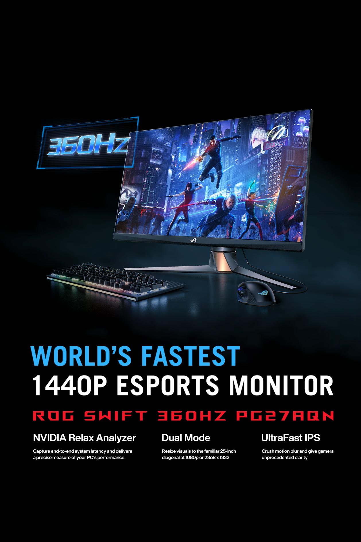 ROG Swift 360Hz PG27AQN is the world’s fastest 1440p esports gaming monitor, allowing competitive players to take advantage of the newest NVIDIA ® GeForce RTX ® 40-series graphics cards to play the latest gaming titles in 2560 x 1440 resolution (1440p) at an astounding 360 Hz. Swift 360Hz PG27AQN features ASUS UltraFast IPS technology to deliver the fastest response time of any IPS display available. Additionally, it has a built-in NVIDIA G-SYNC processor and NVIDIA Reflex Analyzer to ensure tear-free visuals and system latency as low as 10 milliseconds in top esports titles when paired with PCs featuring the latest GeForce RTX 40-series graphics cards.