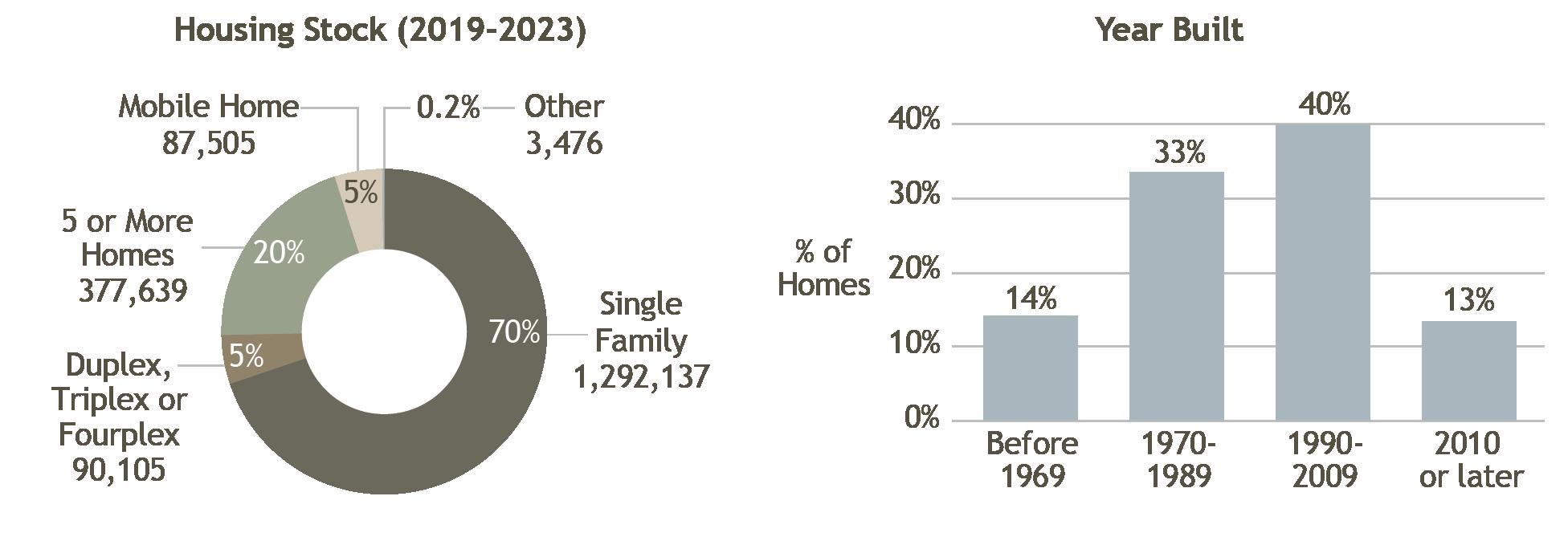 According to the 2019-2023 American Community Survey (ACS) estimates, there were 475,378 homes in Pima County. The majority (67%) of homes were single-family homes (SFH). Of the 5,268 homes permitted in 2024, 79% were SFH. Since 2018, the county has increased the number of homes in its housing stock by 4%. Under half (44%) of homes were built since 1990. The 2019-2023 ACS 5-year estimates show that 9.3% of homes in Pima County were vacant.1