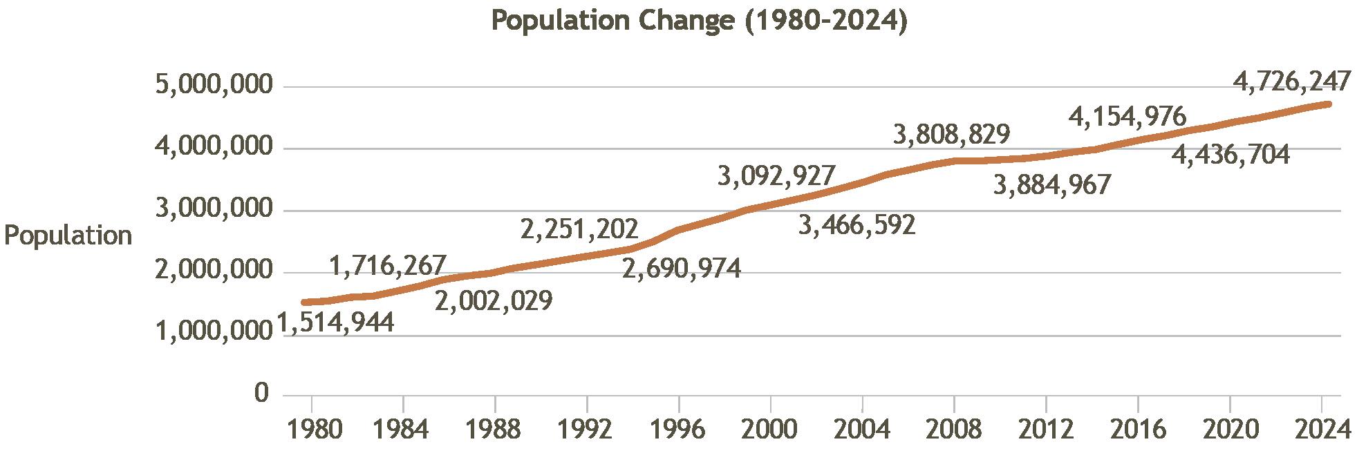 Maricopa County has more than tripled its population since 1980. In 2024, the population rose to 4,726,247, making it the most populous county in the state. In 2023, there were 1,697,342 households in Maricopa County, an 11.6% increase since 2018, the 7th fastest growth rate of Arizona’s counties.