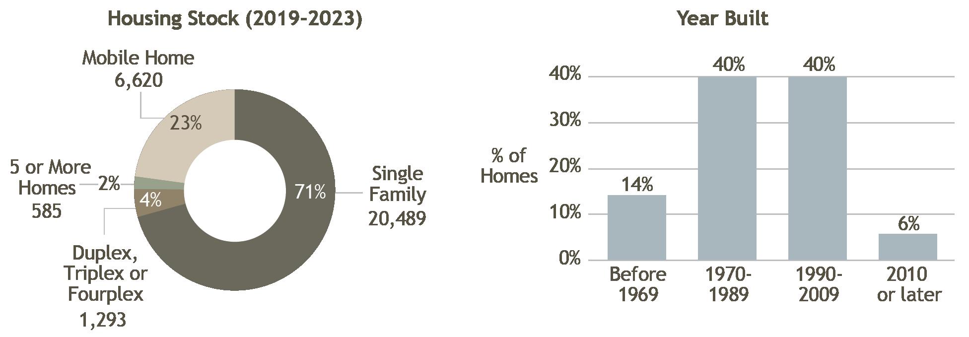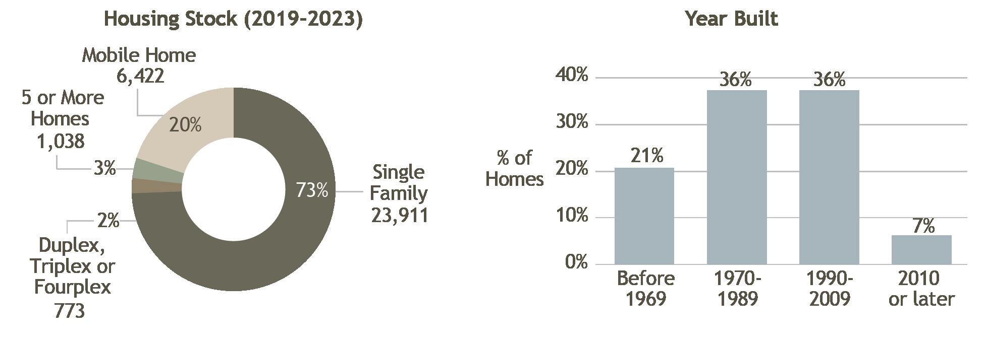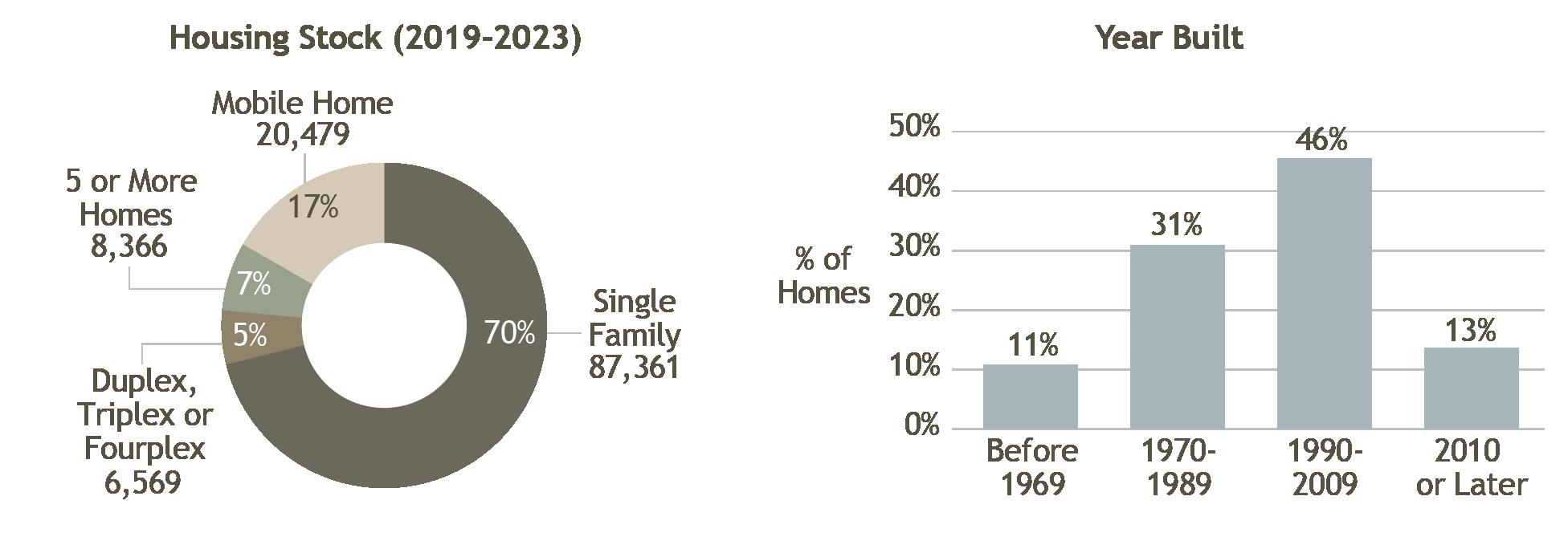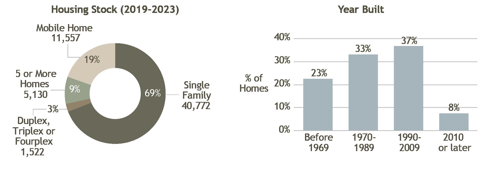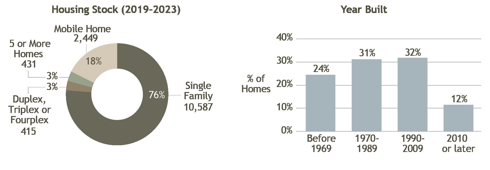 According to the 2019-2023 American Community Survey (ACS) estimates, there were 13,941 homes in Graham County. The majority (76%) of homes were single family homes (SFH).1 In 2024, out of the 137 homes permitted, all but four units were SFH. Since 2018, the county has increased the number of homes in its housing stock by 4%. Less than half (45%) of all homes were built since 1990. The 2019-2023 ACS 5-year estimates show that 10% of homes in Graham County were vacant.2