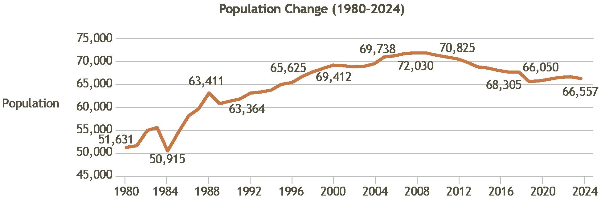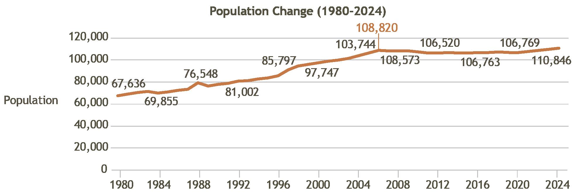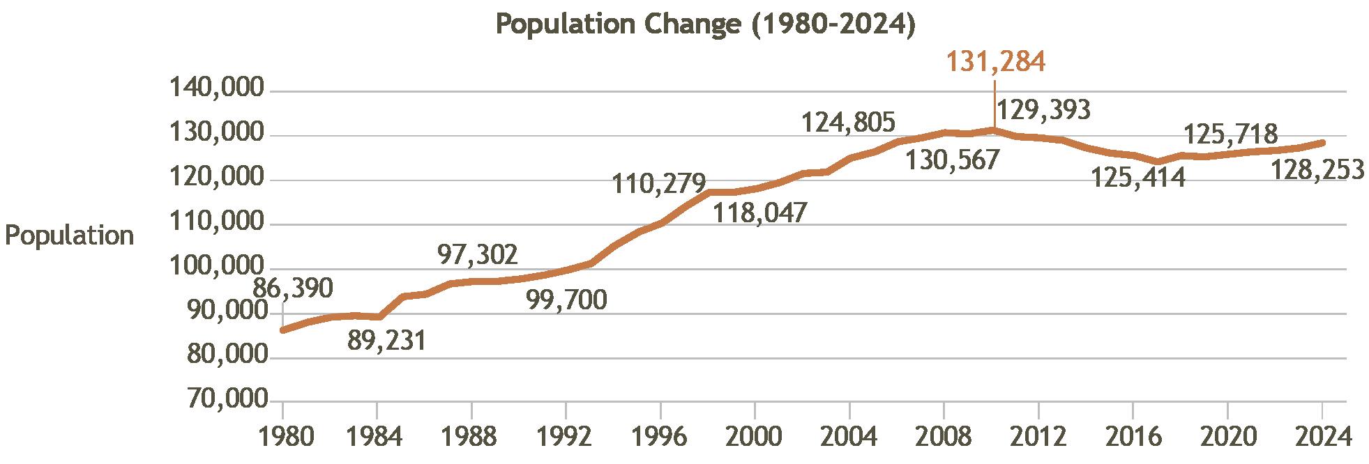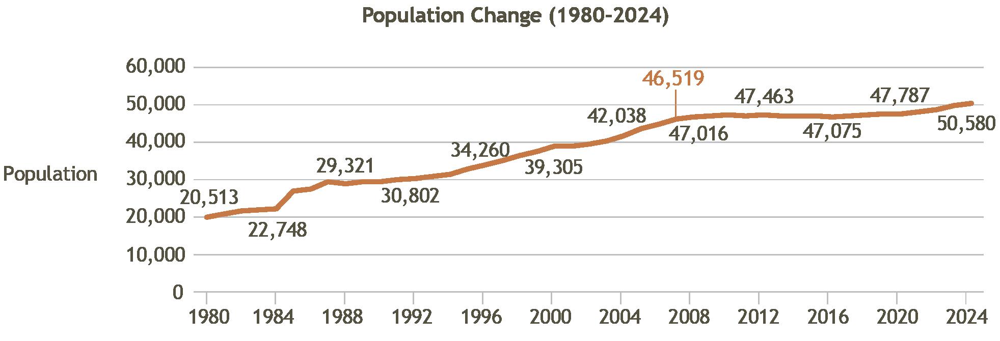 Cochise County’s population peaked in 2010 at 131,248. After a slight decrease thereafter, the population grew to 128,253 in 2024, making it the 8th most populous county in the state. In 2023, there were 50,476 households in Cochise, representing a 2.5% increase since 2018, the 3rd slowest growth rate of Arizona’s counties.