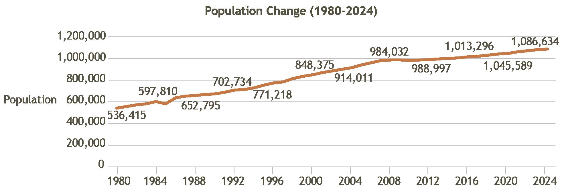Pima County has grown steadily since the 1980s, with a population of 1,086,634 in 2024, making it the 2 nd most populous county in the state, behind Maricopa. There are 430,965 households in Pima, which grew 7.5% since 2018, the 9th fastest growth rate of Arizona’s counties.