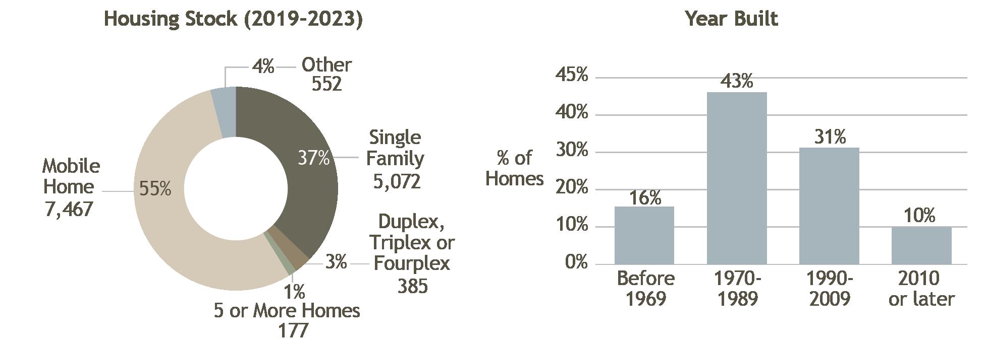 According to the 2019-2023 American Community Survey (ACS) estimates, there were 13,653 homes in La Paz County. Differing from state housing stock trends, the majority of homes (55%) were mobile homes, rather than single-family homes (SFH).1 All 92 of the homes permitted in 2024 were SFH. Since 2018, the county has lost 16% of its homes. Only 41% of all homes were built since 1990. The 2019-2023 ACS 5-year estimates show that 35% of homes in La Paz County were vacant.2