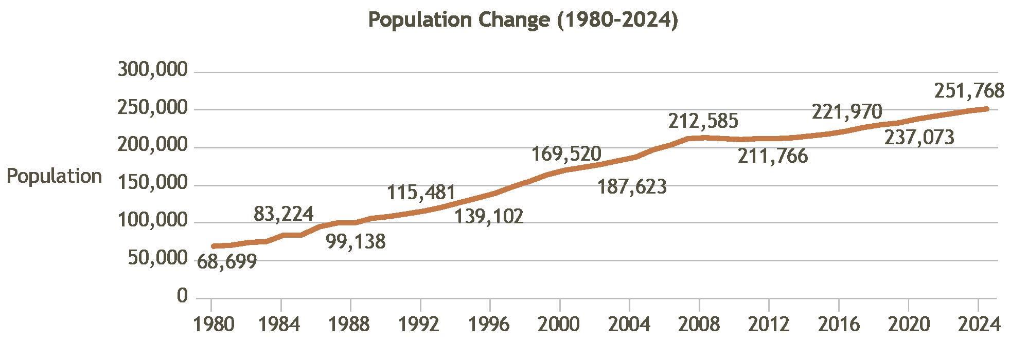 Yavapai County’s population has grown steadily since the 1980s. In 2024, the population was 251,768, making it the 4th most populous county in the state. There were 108,900 households in Yavapai County, evidencing a 13.4% increase since 2018, the 5th fastest growth rate of Arizona’s counties.