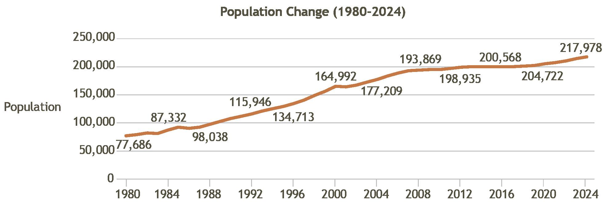 Yuma County’s population has steadily increased. In 2024, the population reached 217,978, making it the 6th most populous county in the state. There were 76,903 households in Yuma County, evidencing a 6.1% increase since 2018, the 12th fastest growth rate of Arizona’s counties.