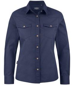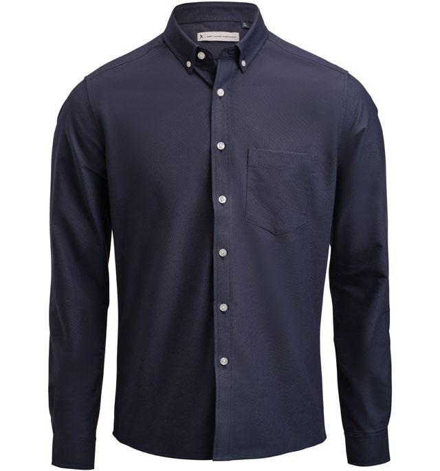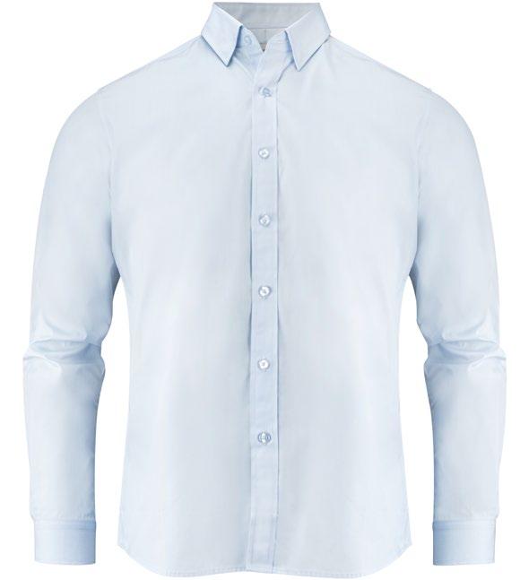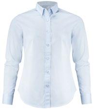 Jerseyskjorta med oxford-look. Vävda detaljer inuti krage och sidoslitsar. ”Button down” krage på herr. Bystinsnitt och figursydd i ryggen på dam. Pärlemorfärgade knappar. Reglerbara manschetter.