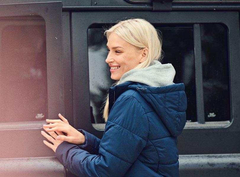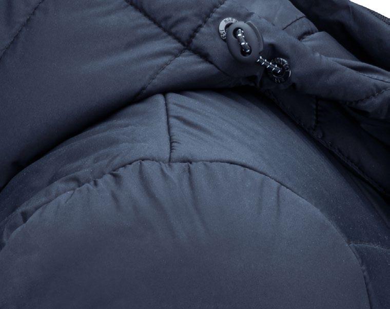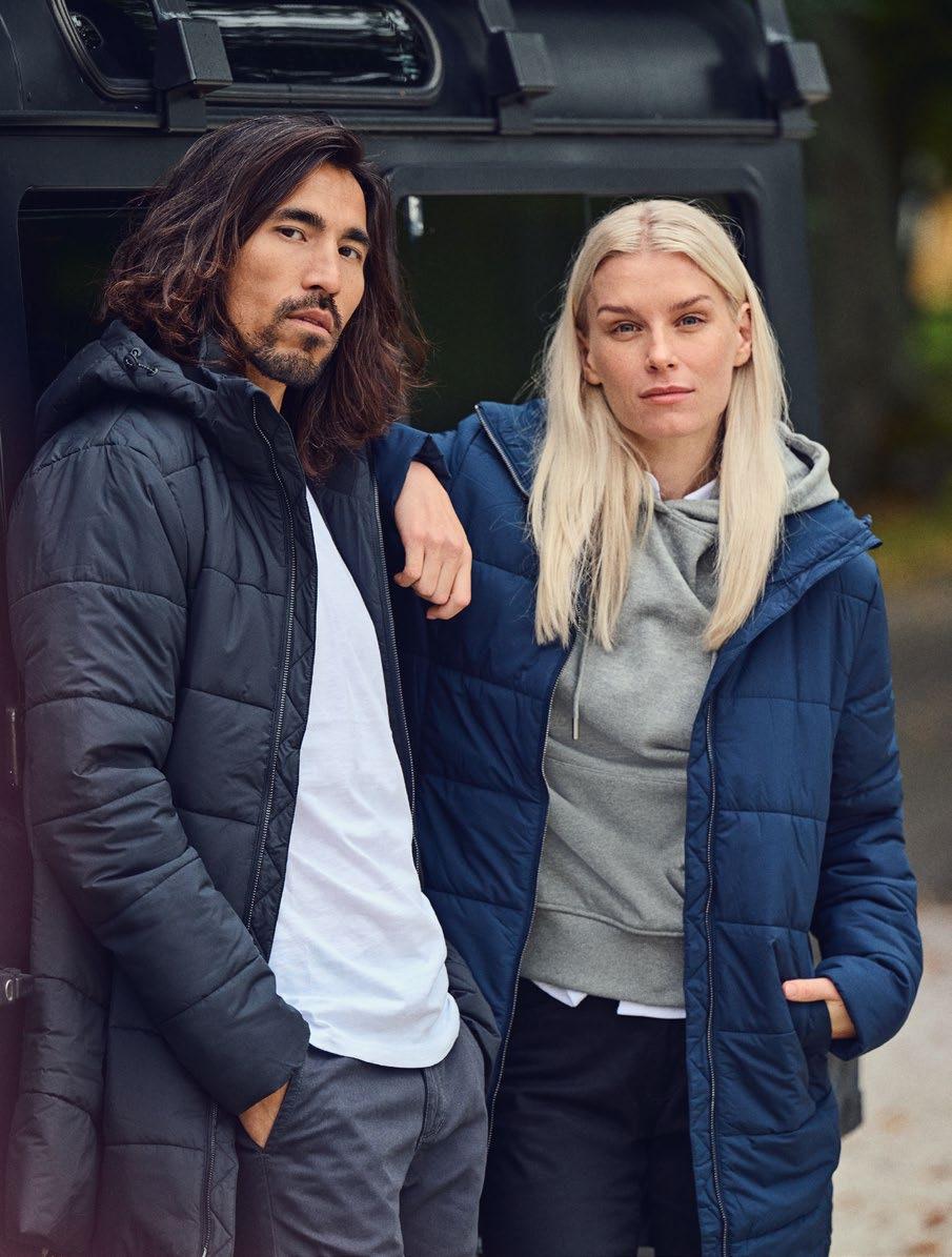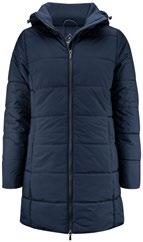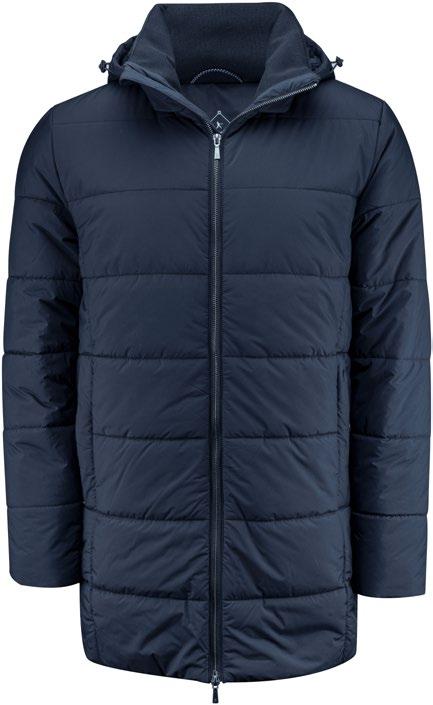 Längre vadderad jacka med tvåvägsdragkedja. Avtagbar huva, justerbar med elastiska snören. Ribbad krage och ärmslut. Två fickor med dragkedja på sidorna. Bröstficka med dragkedja inuti. Mjukt stickat tyg inuti sidofickorna. Förpackad i en biobaserad, komposterbar påse.