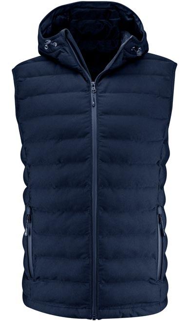 Vadderad väst. Vind- och vattentätt material med andasfunktion. Släta, vattentäta blixtlås fram och i sidfickor. Innerfickor. Justerbar huva med elastiska snören. Förpackad i en biobaserad, komposterbar påse.