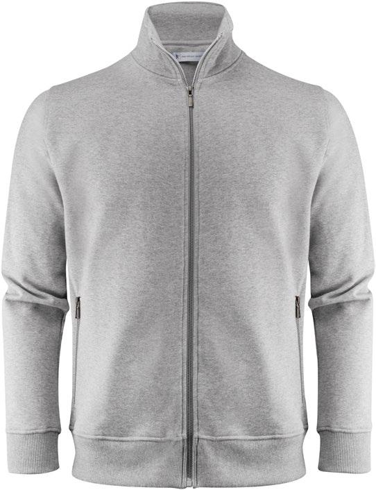 Collegejacka med dragkedja. Halvmåne i nacken. Borstad på insidan. Ribbstickade muddar. Oeko-Tex 100 certifierad, certifierad ekologisk bomull och certifierad återvunnen polyester.