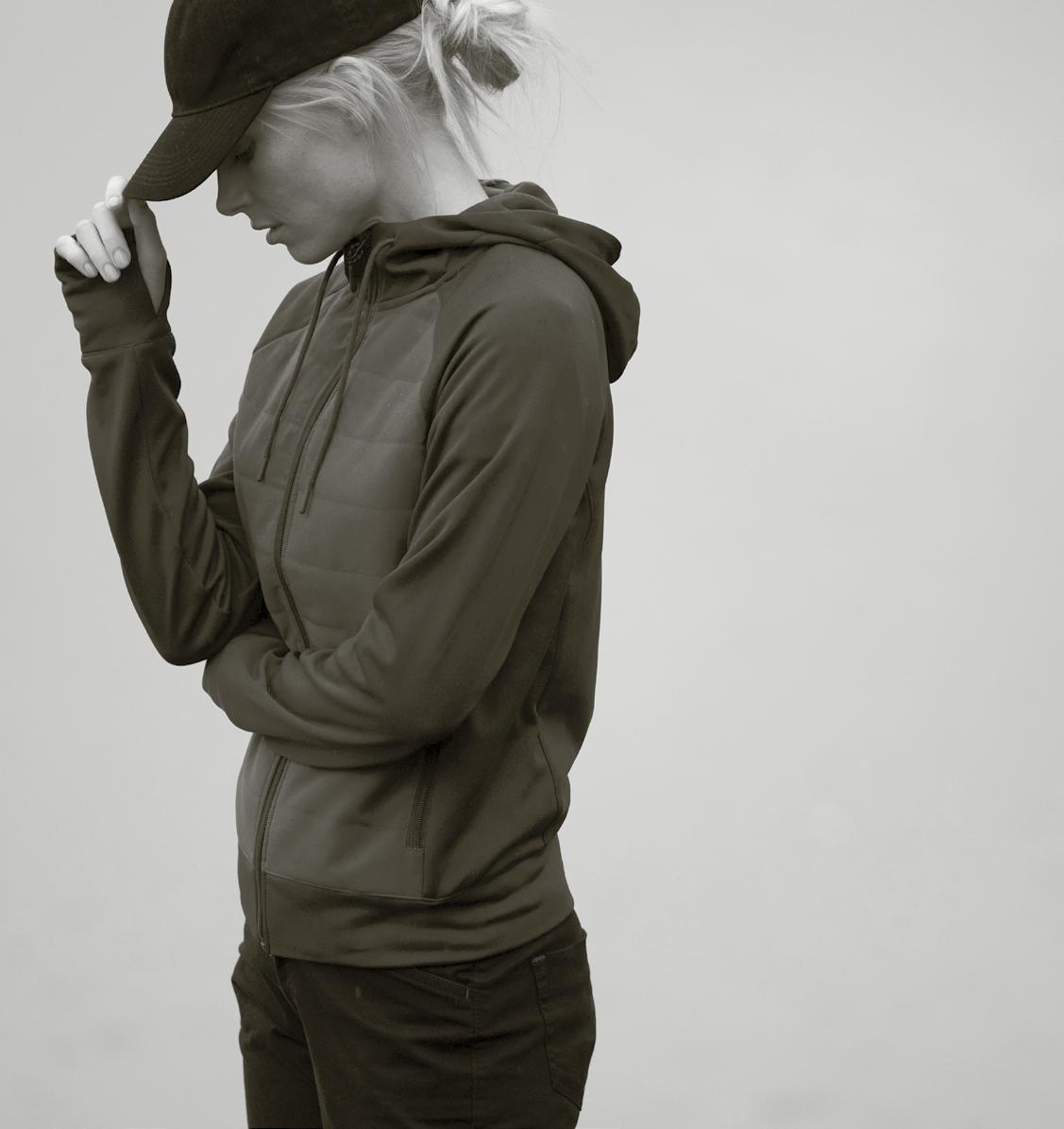 Oborstad, slät fleecejacka med huva, dekorativa flatlocksömmar och tumgrepp.