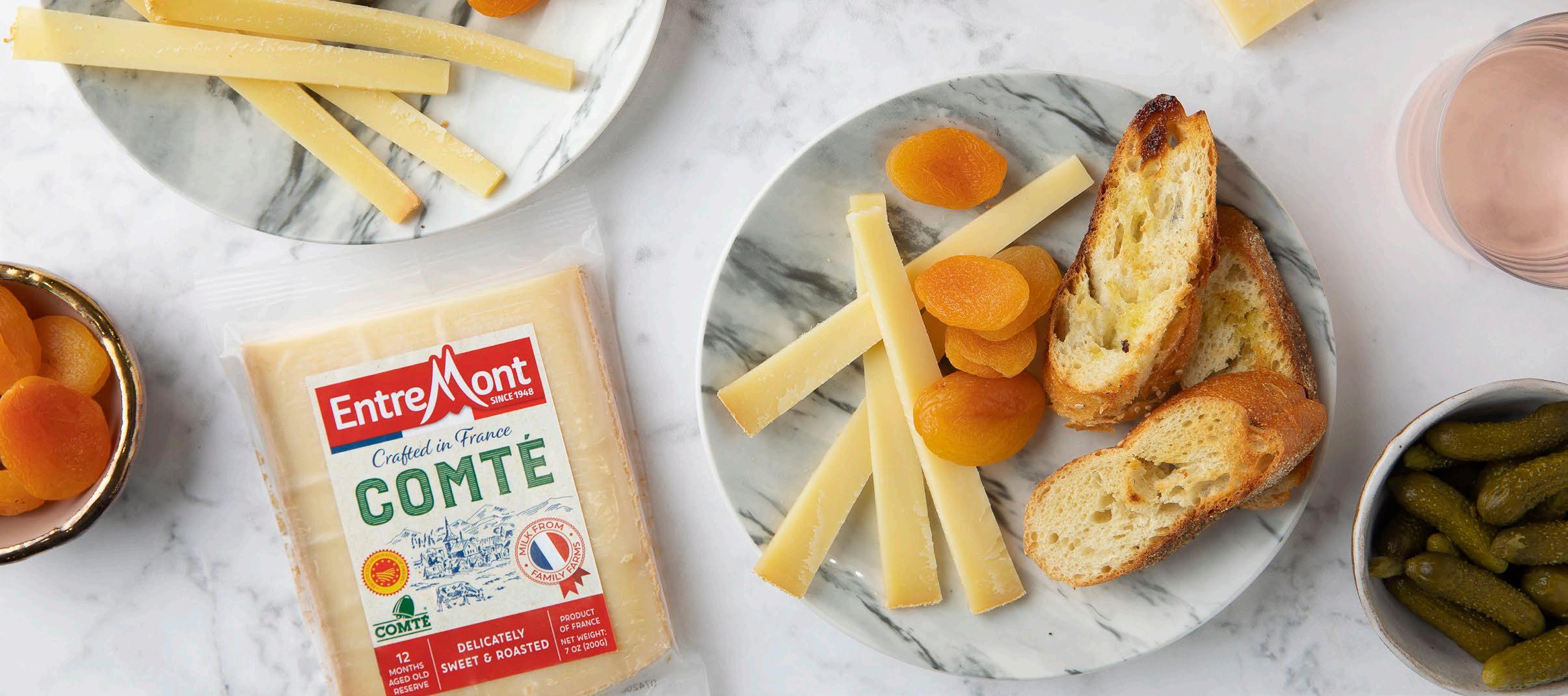 One of the world’s finest cheeses, Comté PDO has been made from the unpasteurized milk of Montbéliarde and French Simmental cows high in the Jura Mountains for centuries. Entremont Comté is aged for 10-12 months in naturally warm caves, resulting in a complex, roasted aroma and a sweet, mountain flavor.