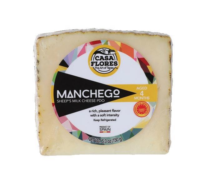 Manchego PDO 4 Month is the youngest aging in the Casa Flores range. This semi-firm cheese has a pale golden hue, smooth texture, and flavor notes of yogurt and buttered toast. Serve with membrillo (quince paste) and Marcona almonds to create a classic Spanish tapas spread.