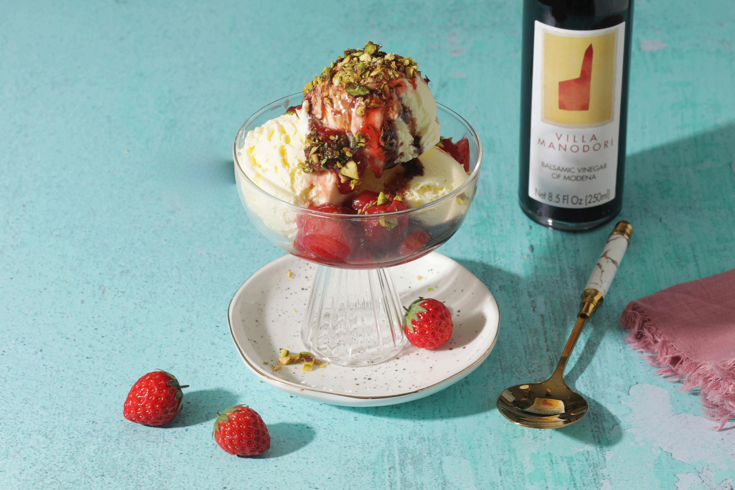 Drizzlewithadditionalbalsamic vinegarandgenerouslysprinkle crushedpistachiosoverthetop Serve immediatelywhilethestrawberriesare stillwarmandthegelatoiscold.