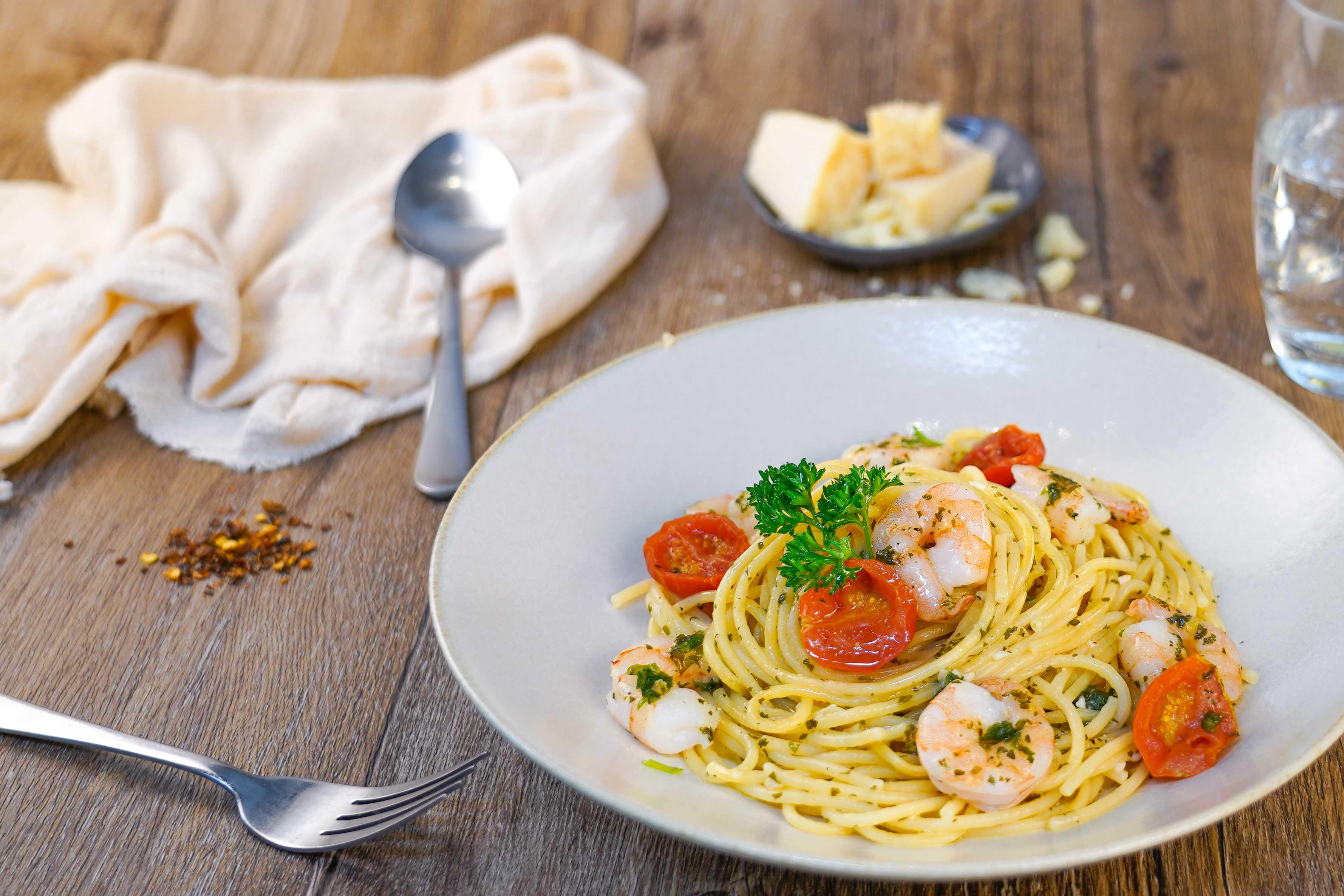 Balanced Meal: Provides a well-rounded dish with protein from shrimp, carbohydrates from spaghetti, and a serving of vegetables from cherry tomatoes, making it a nutritious choice.