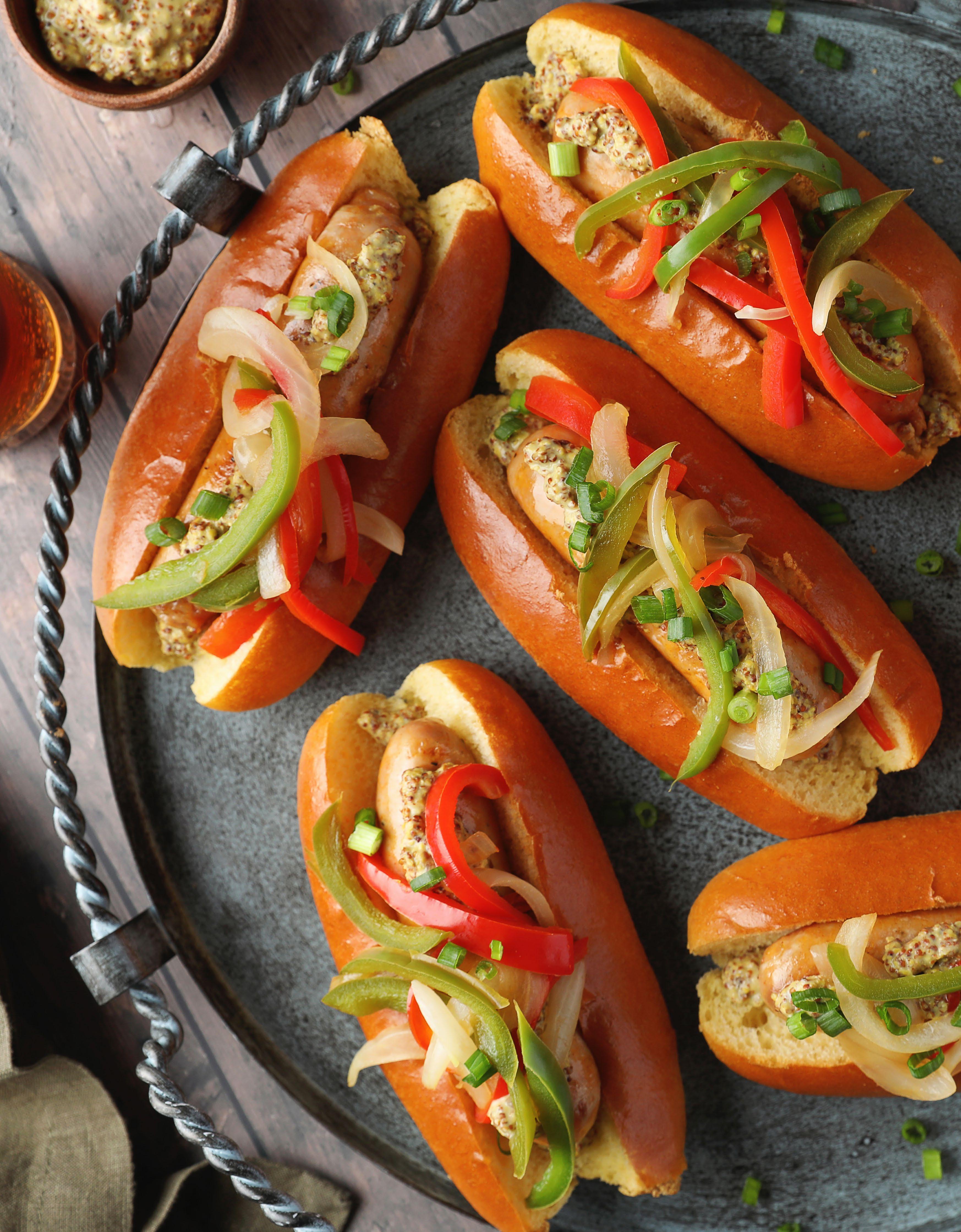 Sausage with Peppers and Onions on a roll made with DEL DESTINO Red & Green Pepper Strips