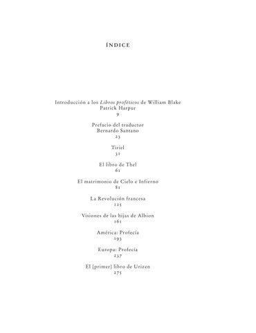 Introducción a los Libros proféticos de William Blake Patrick Harpur 9 Prefacio del traductor Bernardo Santano 23 Tiriel 31 El libro de Thel 61 El matrimonio de Cielo e Infierno 81 La Revolución francesa 125 Visiones de las hijas de Albion 161 América: Profecía 193 Europa: Profecía 237 El [primer] libro de Urizen 275