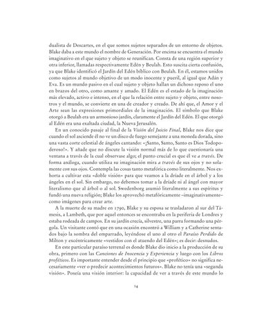 dualista de Descartes, en el que somos sujetos separados de un entorno de objetos. Blake daba a este mundo el nombre de Generación. Por encima se encuentra el mundo imaginativo en el que sujeto y objeto se reunifican. Consta de una región superior y otra inferior, llamadas respectivamente Edén y Beulah. Esto suscita cierta confusión, ya que Blake identificó el Jardín del Edén bíblico con Beulah. En él, estamos unidos como sujetos al mundo objetivo de un modo inocente y pueril, al igual que Adán y Eva. Es un mundo pasivo en el cual sujeto y objeto hallan un dichoso reposo el uno en brazos del otro, como amante y amado. El Edén es el estado de la imaginación más elevado, activo e intenso, en el que la relación entre sujeto y objeto, entre nosotros y el mundo, se convierte en una de creador y creado. De ahí que, el Amor y el Arte sean las expresiones primordiales de la imaginación. El símbolo que Blake otorgó a Beulah era un armonioso jardín, claramente el Jardín del Edén. El que otorgó al Edén era una exaltada ciudad, la Nueva Jerusalén. En un conocido pasaje al final de la Visión del Juicio Final, Blake nos dice que cuando el sol asciende él no ve un disco de fuego semejante a una moneda dorada, sino una vasta corte celestial de ángeles cantando: «¡Santo, Santo, Santo es Dios Todopoderoso!». Y añade que no discute la visión normal más de lo que cuestionaría una ventana a través de la cual observase algo; el punto crucial es que él ve a través. De forma análoga, cuando utiliza su imaginación mira a través de sus ojos y no solamente con sus ojos. Contempla las cosas tanto metafórica como literalmente. Nos exhorta a cultivar esta «doble visión» para que veamos a la dríade en el árbol y a los ángeles en el sol. Sin embargo, no debemos tomar a la dríade ni al ángel con mayor literalismo que al árbol o al sol. Swedenborg asumió literalmente a sus espíritus y fundó una nueva religión; Blake los aprovechó metafóricamente –imaginativamente– como imágenes para crear arte. A la muerte de su madre en 1790, Blake y su esposa se trasladaron al sur del Támesis, a Lambeth, que por aquel entonces se encontraba en la periferia de Londres y estaba rodeada de campos. En su jardín crecía, silvestre, una parra formando una pérgola. Un visitante contó que en una ocasión encontró a William y a Catherine sentados bajo la sombra del emparrado, leyéndose el uno al otro el Paraíso Perdido de Milton y excéntricamente «vestidos con el atuendo del Edén»; es decir: desnudos. En este particular paraíso terrenal es donde Blake dio inicio a la producción de su obra, primero con las Canciones de Inocencia y Experiencia y luego con los Libros proféticos. Es importante entender desde el principio que «profético» no significa necesariamente «ver o predecir acontecimientos futuros». Blake no tenía una «segunda visión». Poseía una visión interior: la capacidad de ver a través de este mundo lo 14
