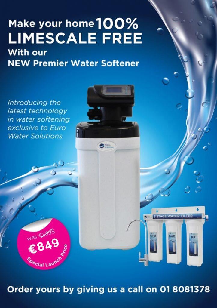 The Euro Water Solutions Premier water softener uses a dual system (timed & metered) operation to guarantee 100% limescale free water 24/7, unlike standard timed-only units Furthermore, the Premier consumes over 65% less salt and water than industry standard softeners due to being equipped with upgraded ceramic components and the latest water softening technology available Combined with our three-stage ltration drinking water system, you can enjoy the bene ts of soft water and premium ltered drinking water in your home today!”