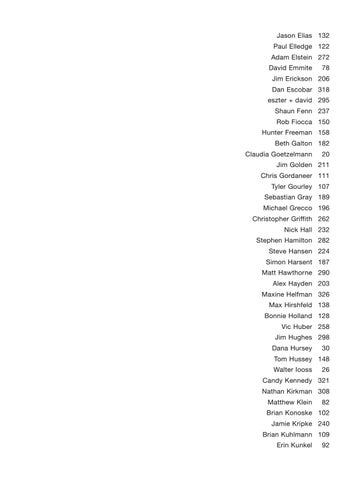 Jim Erickson 206 Dan Escobar 318 eszter + david 295 Shaun Fenn 237 Rob Fiocca 150 Hunter Freeman 158 Beth Galton 182 Claudia Goetzelmann