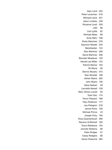 Toshi Oku 174 Trevor Pearson 186 Toby Pederson 177 Joe Pellegrini 276 James Porto 100 Michael Prince
