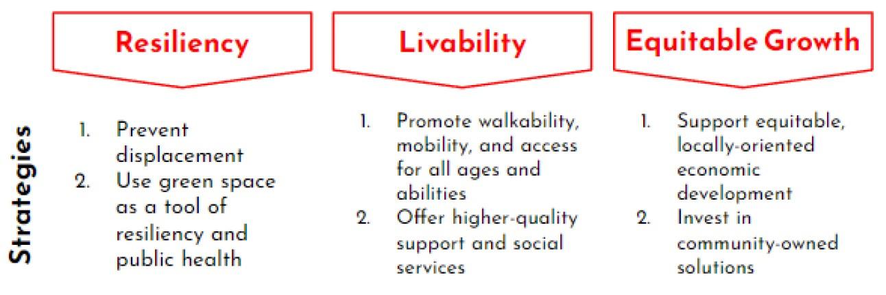 The planning process is developed under a sustainability framework, including the elements of economic, environmental, and social values. Through that framework, we identified a set of interventions designed around activating vacant lots as a means to achieve our planning goals. The process developed a series of definitions, but also was recursive, defining how we approached the planning process. This process helped refined our vision, goals, strategies, and metrics. Taking these factors, we evaluated community alternatives, including future projections as well as a continuation of the status quo. Finally, the report will detail a commercial corridor case study of the recommended implementationforBronzeville.