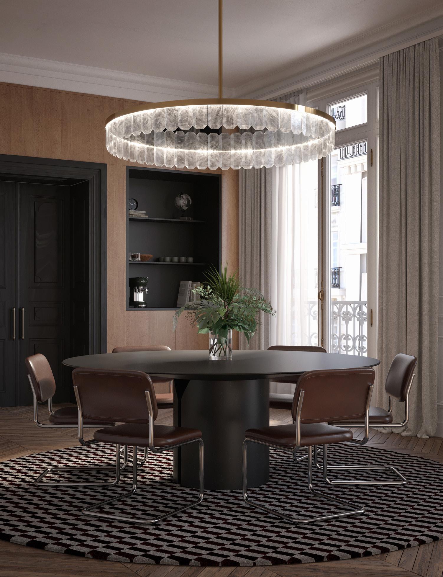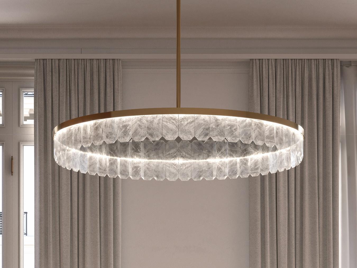 A semi-precious stone of exceptional clarity and natural irregularities, rock crystal elevates light with unique reflections. At Alain Ellouz Paris, this extraordinary material is transformed into spectacular creations, pendants, chandeliers, sconces, combining elegance, purity, and refinement.