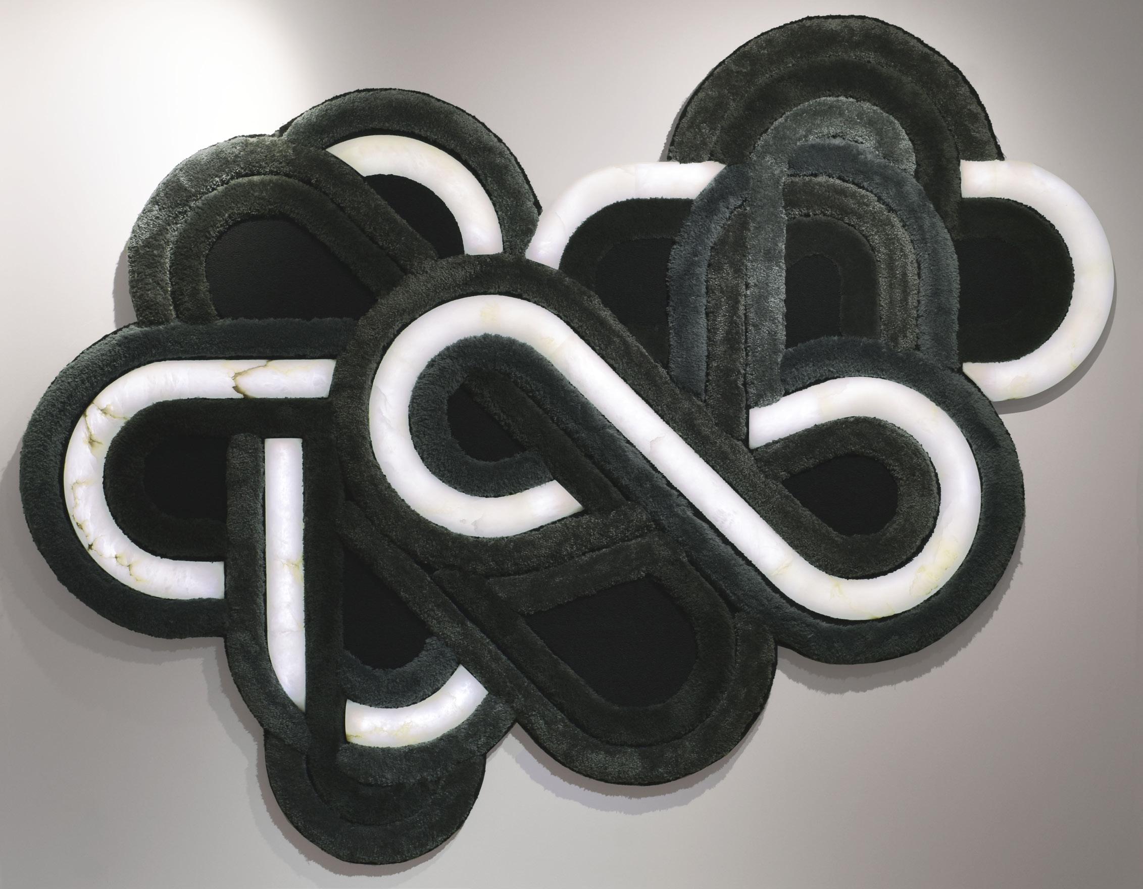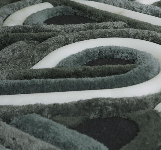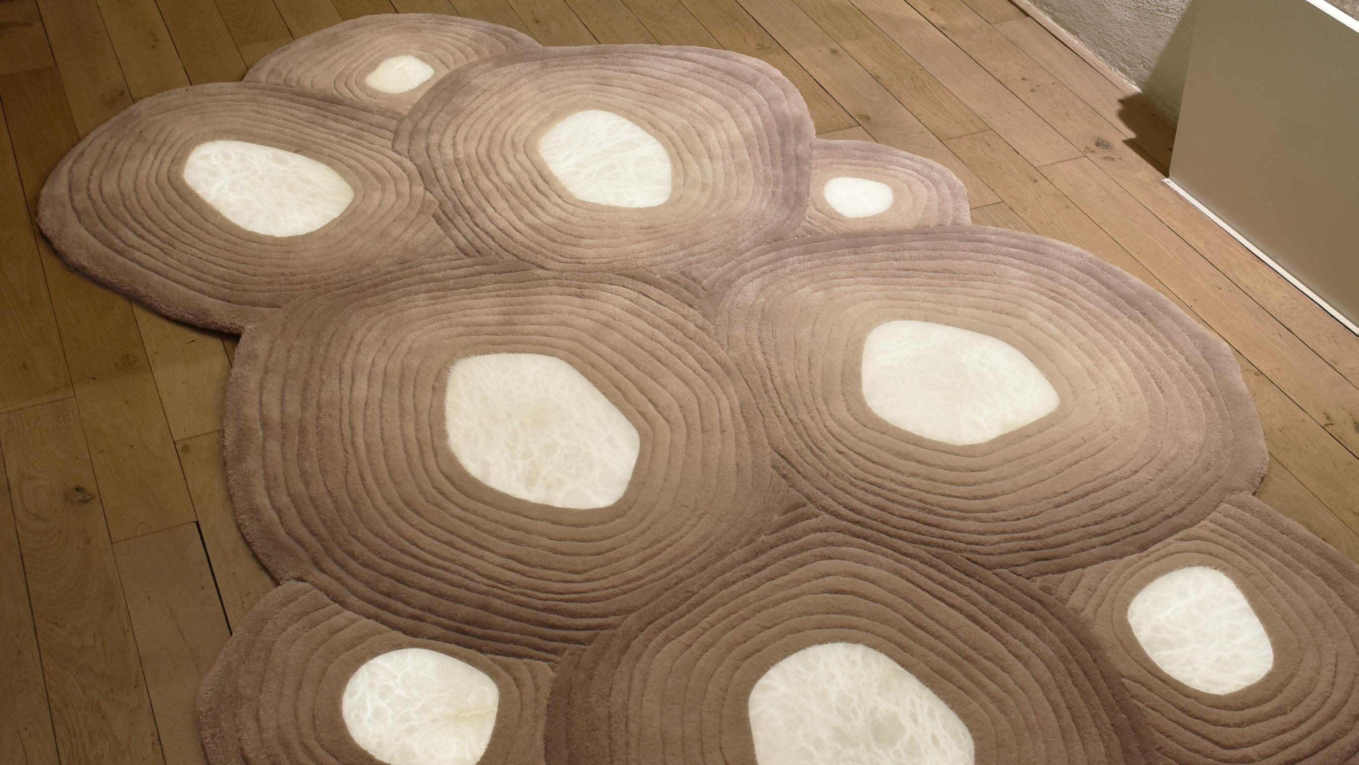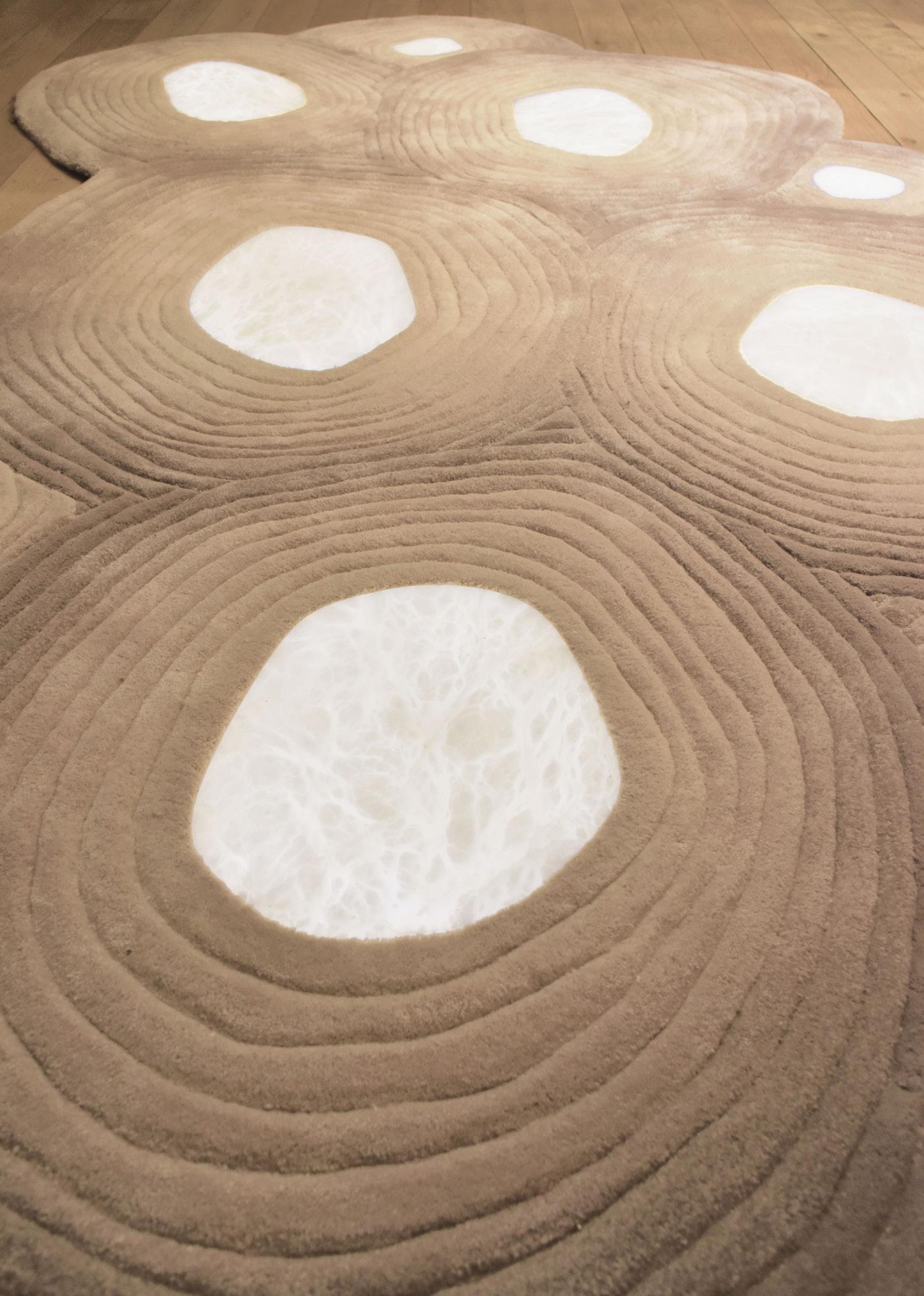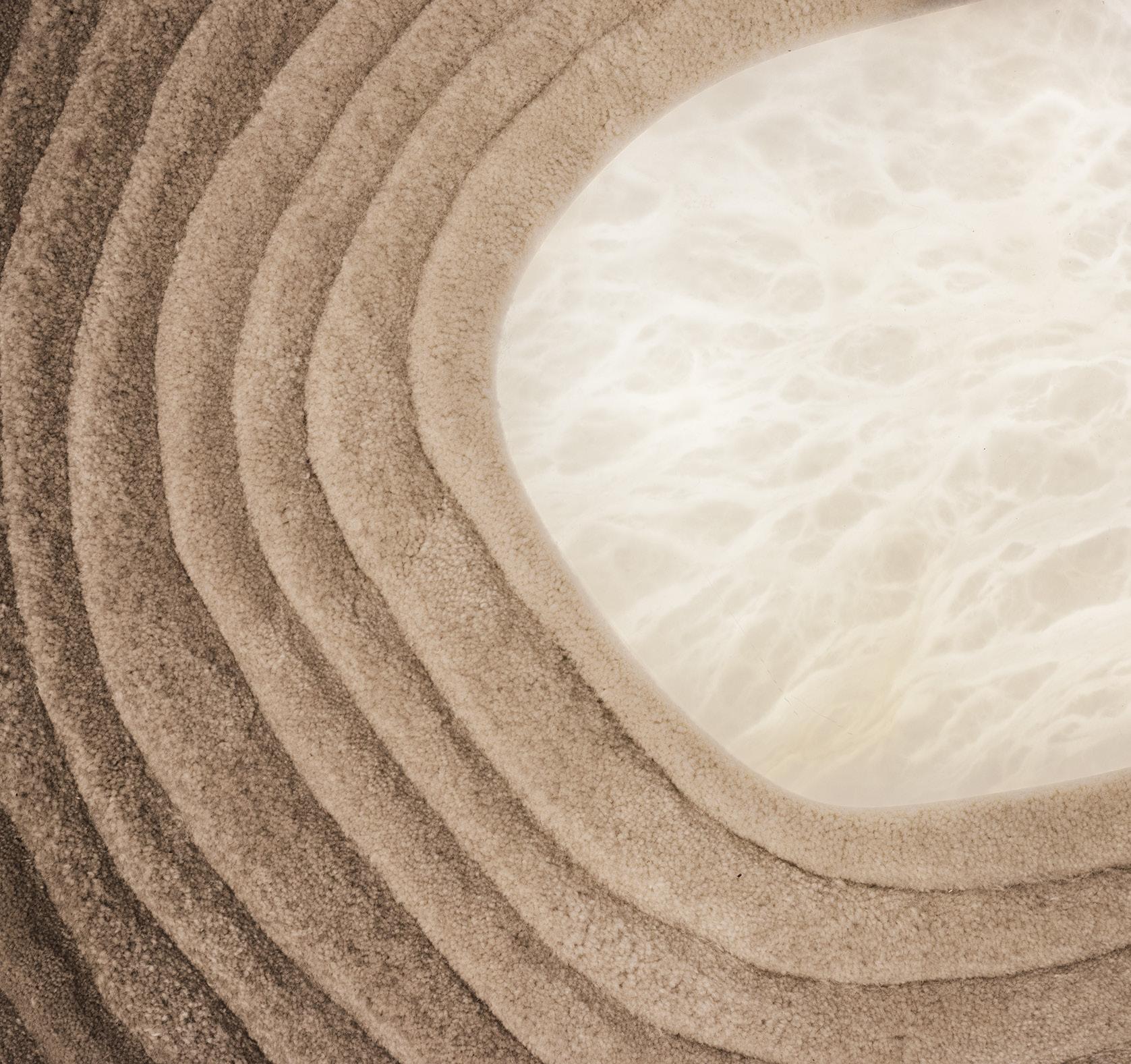 Hand-sculpted pebbles emerge from the wool, casting a gentle glow that transforms the floor into an interior landscape. Neither a simple light fixture nor a mere rug, Echo redefines space as a manifesto where matter and light are reinvented.