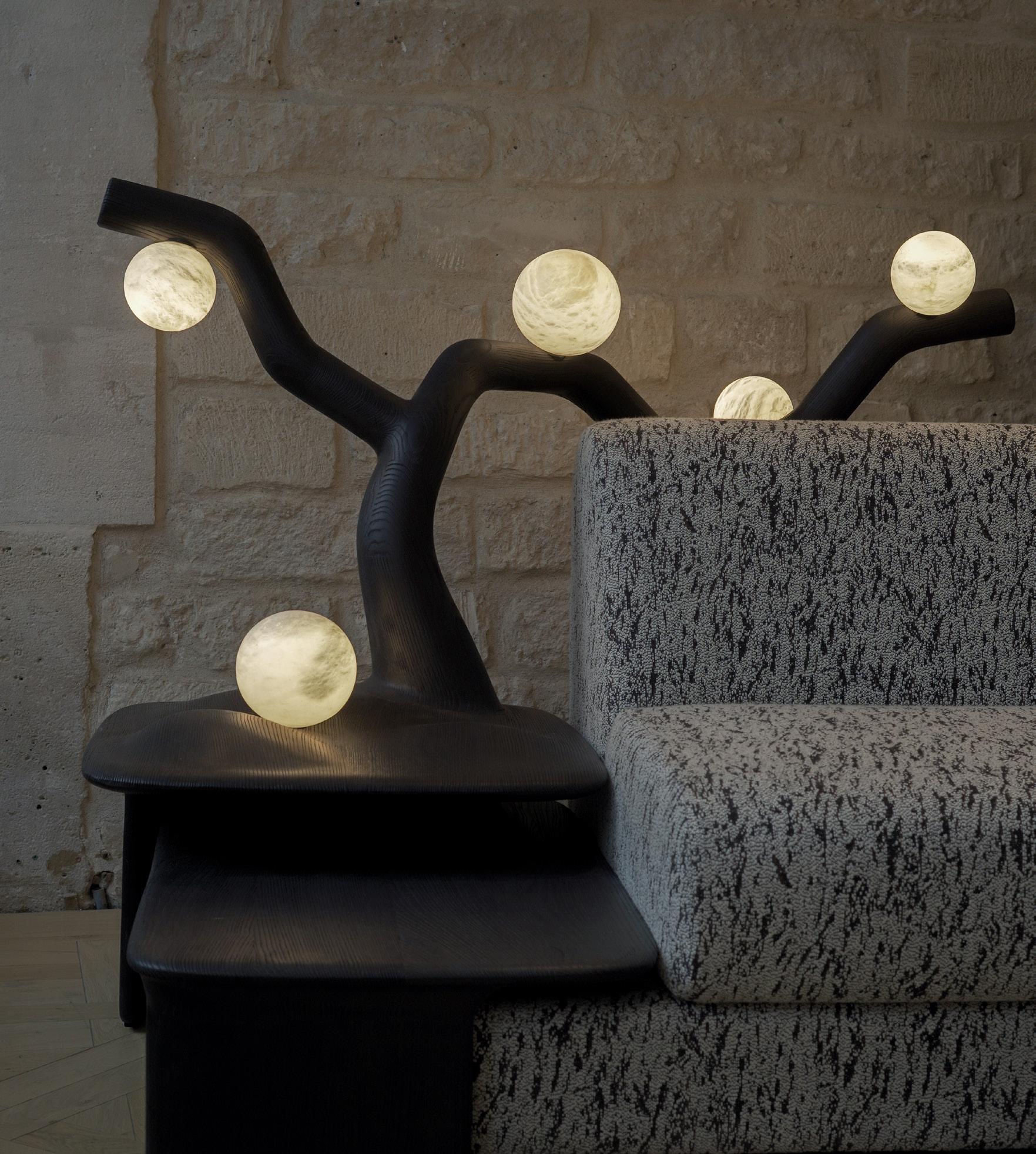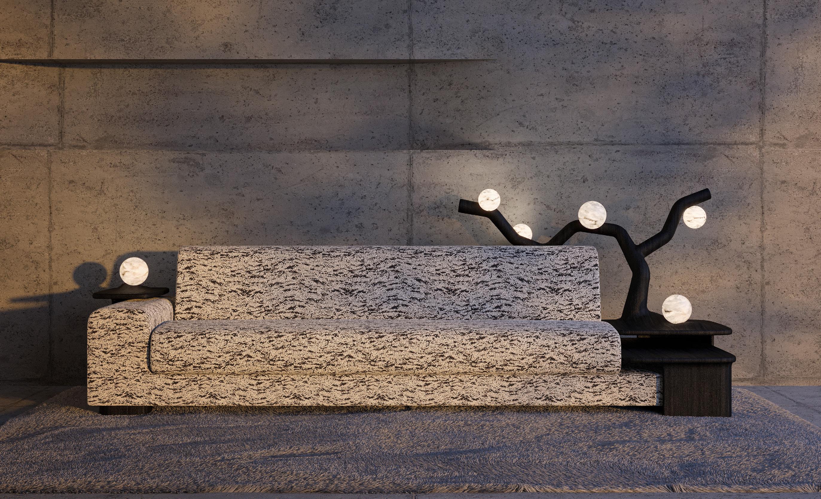 The first sofa where light is integrated into the seat itself. More than furniture, it is a statement, the encounter of mineral alabaster and wood patinated with Chinese ink, transcended by light. A manifesto piece that redefines the codes of furniture and establishes luxury as a total, daring, and visionary experience.