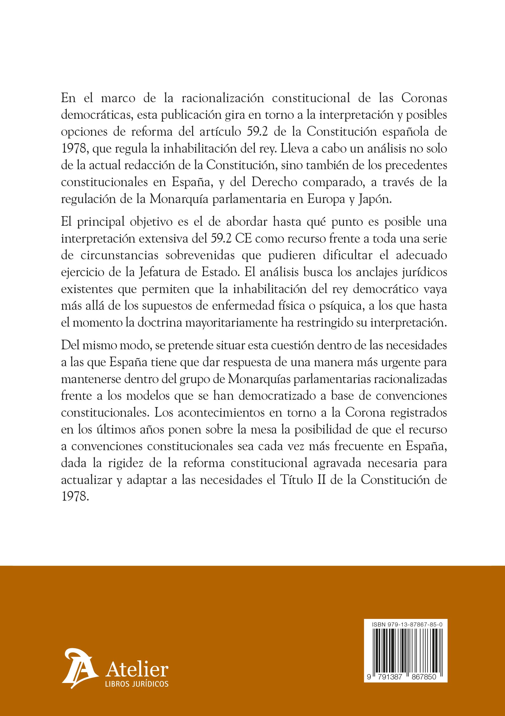 Esta publicación es el fruto de la investigación llevada a cabo para la tesis doctoral titulada La inhabilitación del rey en la Monarquía parlamentaria, presentada en 2025 en la Facultad de Derecho de la Universidad Complutense de Madrid (UCM) ante un tribunal integrado por Göran Rollnert Liern, Elviro Aranda Álvarez y Enriqueta Expósito Gómez, como vocales; Carmen Montesinos Padilla, como secretaria, y Javier García Roca, como presidente. A todos ellos agradezco el tiempo de lectura dedicado a la tesis, así como las consideraciones hechas durante el acto de defensa.