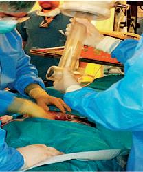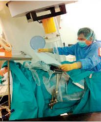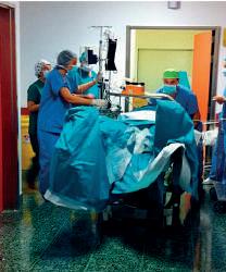 colocación del paciente, el cálculo y la elaboración del tratamiento. Resultaba un procedimiento muy complejo, dado que en estos primeros pacientes había que trasladarlos en la propia mesa de quirófano teniendo que mantener el campo estéril, desplazando también el equipo de anestesia, para proceder a irradiar el volumen de nido y regresar al quirófano para completar la cirugía.