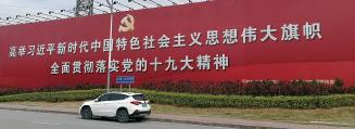 Sotto, “Teniamo alta la bandiera del socialismo e del Partito Comunista Cinese”, un murales di propaganda in tipico stile sovietico
