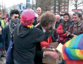 Pochissimi minuti dopo l’inizio della campagna, ecco che arriva una caterva di militanti LGBT. Erano intorno a cento Alcuni avevano il volto coperto da sciarpe, oppure indossavano caschi integrali Erano evidentemente preparati per la guerriglia urbana. Inferociti, ci hanno subito aggredito fisicamente in modo piuttosto violento Solo la nostra calma e superiorità morale, e soprattutto uno speciale