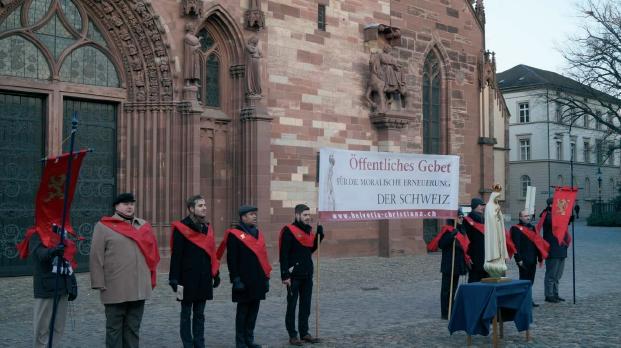 Sulla Münster Platz, davanti alla Basler Münster, la cattedrale di Basilea, una volta cattolica e dedicata a Maria Santissima, oggi invece simbolo del protestantesimo elvetico, l’associazione Helvetia Christiana, consorella delle TFP, ha tenuto un Rosario pubblico per il rinnovamento morale della Svizzera (foto sopra) Alcuni amici si sono aggregati ai ragazzi della TFP nella recita della preghiera mariana, chiedendo a Dio per mezzo della Madonna che il Paese resista alle cattive tendenze del momento, tenendo lontane dai suoi confini l’agenda LGBT e altre infamie della cosiddetta “rivoluzione culturale” Alla fine, il grido “Für die Schweiz! Tradition! Familie! Privateigentum!” ha chiuso in bellezza una serata carica di significati simbolici.