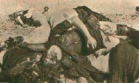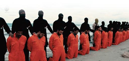 Sopra, copertina della rivista Dabiq: “Rompere la Croce” Sotto, cristiani copti uccisi dall’ISIS nell’Africa del Nord