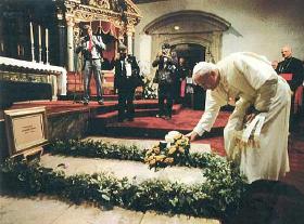 (Nella foto, Giovanni Paolo II deposita un’offrenda floreale sulla tomba di fra Junipero, a Carmel)